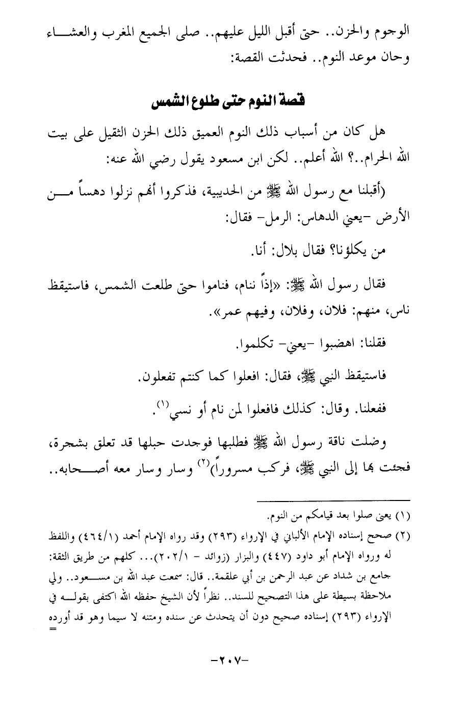 فقال رسول الله - صلى الله عليه وسلم -: "إذًا ننام، فناموا حتى طلعت الشمس، فاستيقظ ناس، منهم: فلان، وفلان، وفيهم عمر".