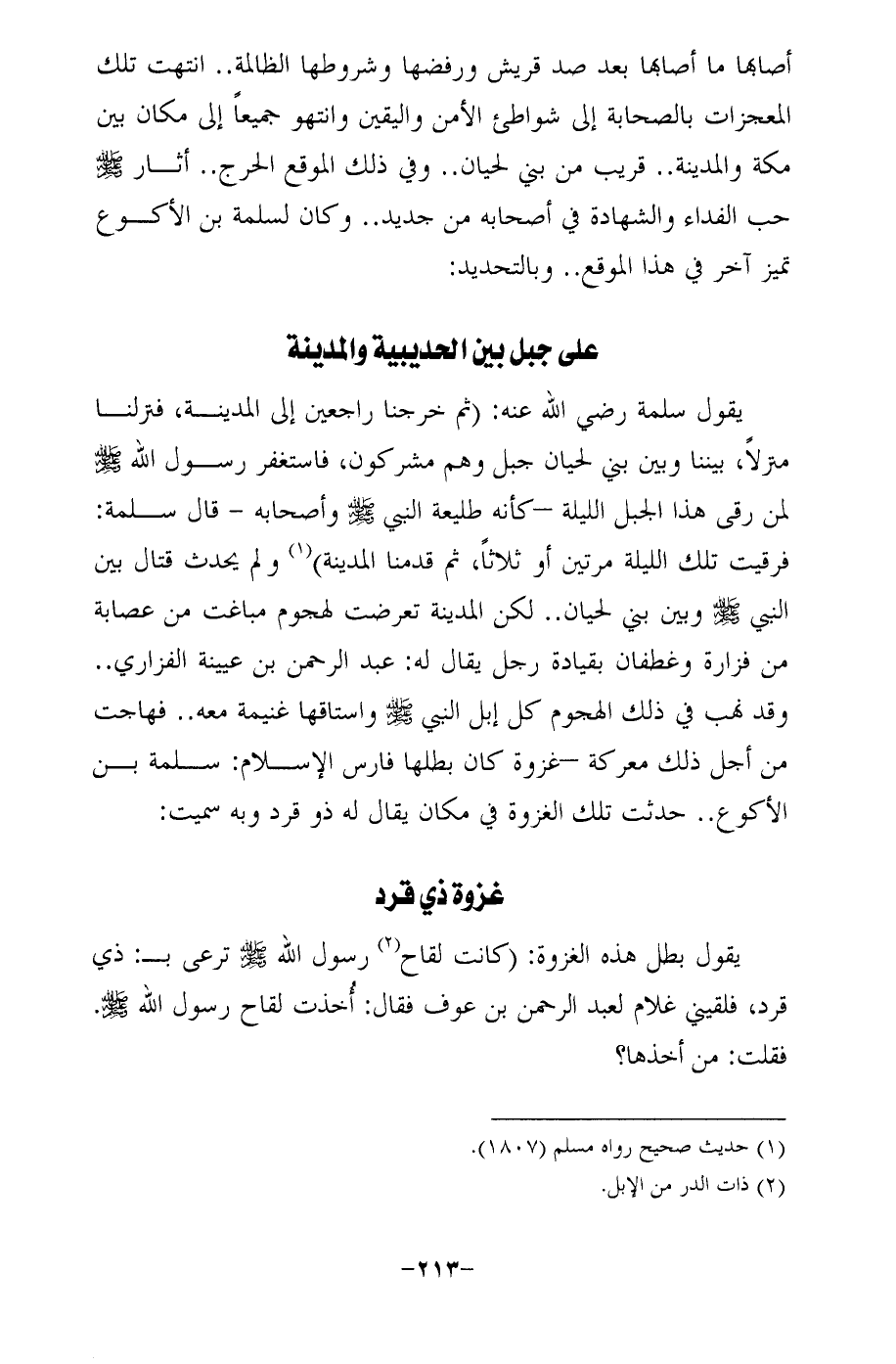 يقول سلمة رضي الله عنه: (ثم خرجنا راجعين إلى المدينة، فنزلنا منزلًا، بيننا وبين بني لحيان جبل وهم مشركون، فاستغفر رسول الله - صلى الله عليه وسلم - لمن رقى هذا الجبل الليلة -كأنه طليعة النبي - صلى الله عليه وسلم - وأصحابه- قال سلمة: فرقيت تلك الليلة مرتين أو ثلاثًا، ثم قدمنا المدينة) (¬1) ولم يحدث قتال بين النبي - صلى الله عليه وسلم - وبين بني لحيان .. لكن المدينة تعرضت لهجوم مباغت من عصابة من فزارة وغطفان بقيادة رجل يقال له: عبد الرحمن بن عيينة الفزاري .. وقد نهب في ذلك الهجوم كل إبل النبي - صلى الله عليه وسلم - واستاقها غنيمة معه .. فهاجت من أجل ذلك معركة - غزوة كان بطلها فارس الإسلام: سلمة بن الأكوع .. حدثت تلك الغزوة في مكان يقال له ذو قرد وبه سميت: