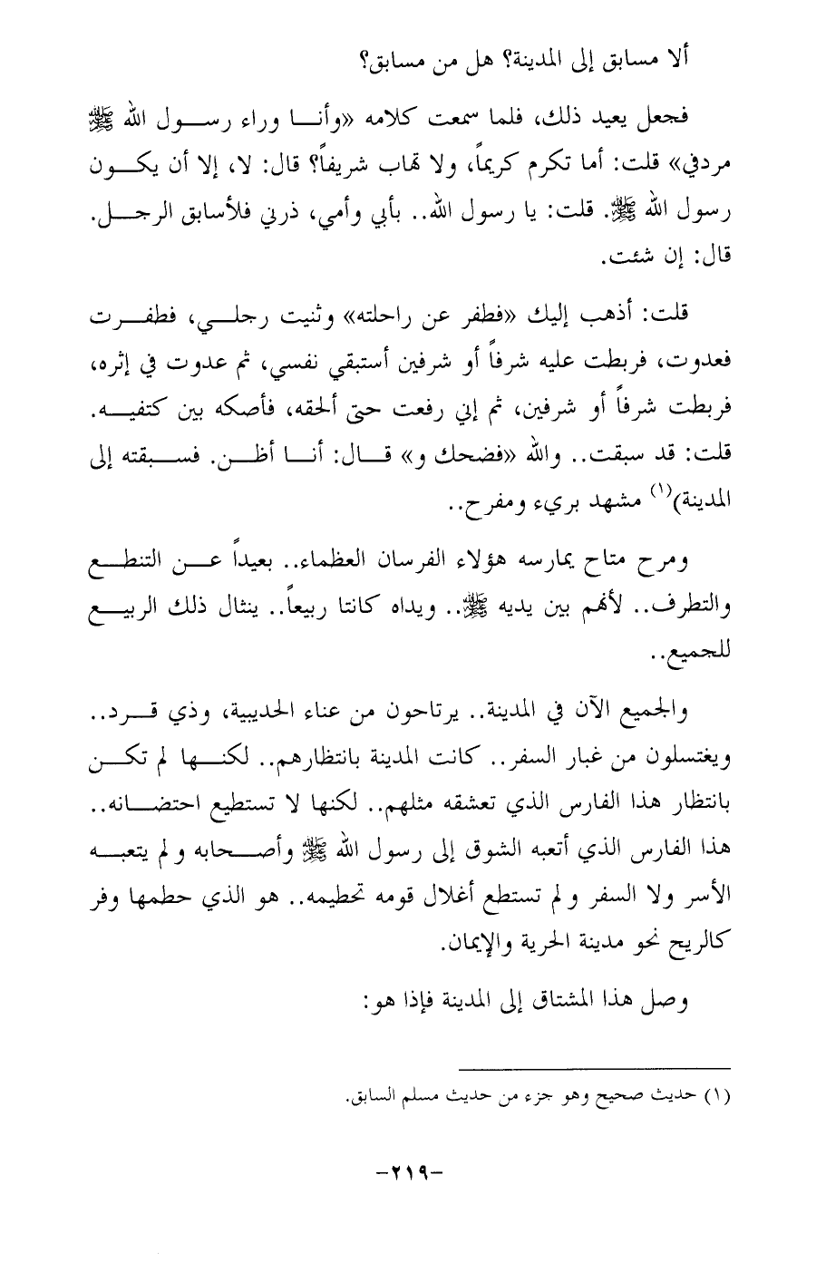 قلت: أذهب إليك "فطفر عن راحلته" وثنيت رجلي، فطفرت فعدوت، فربطت عليه شرفًا أو شرفين أستبقي نفسي، ثم عدوت في إثره، فربطت شرفًا أو شرفين، ثم إني رفعت حتى ألحقه، فأصكه بين كتفيه. قلت: قد سبقت .. والله "فضحك و" قال: أنا أظن. فسبقته إلى المدينة) (¬1) مشهد بريء ومفرح ..