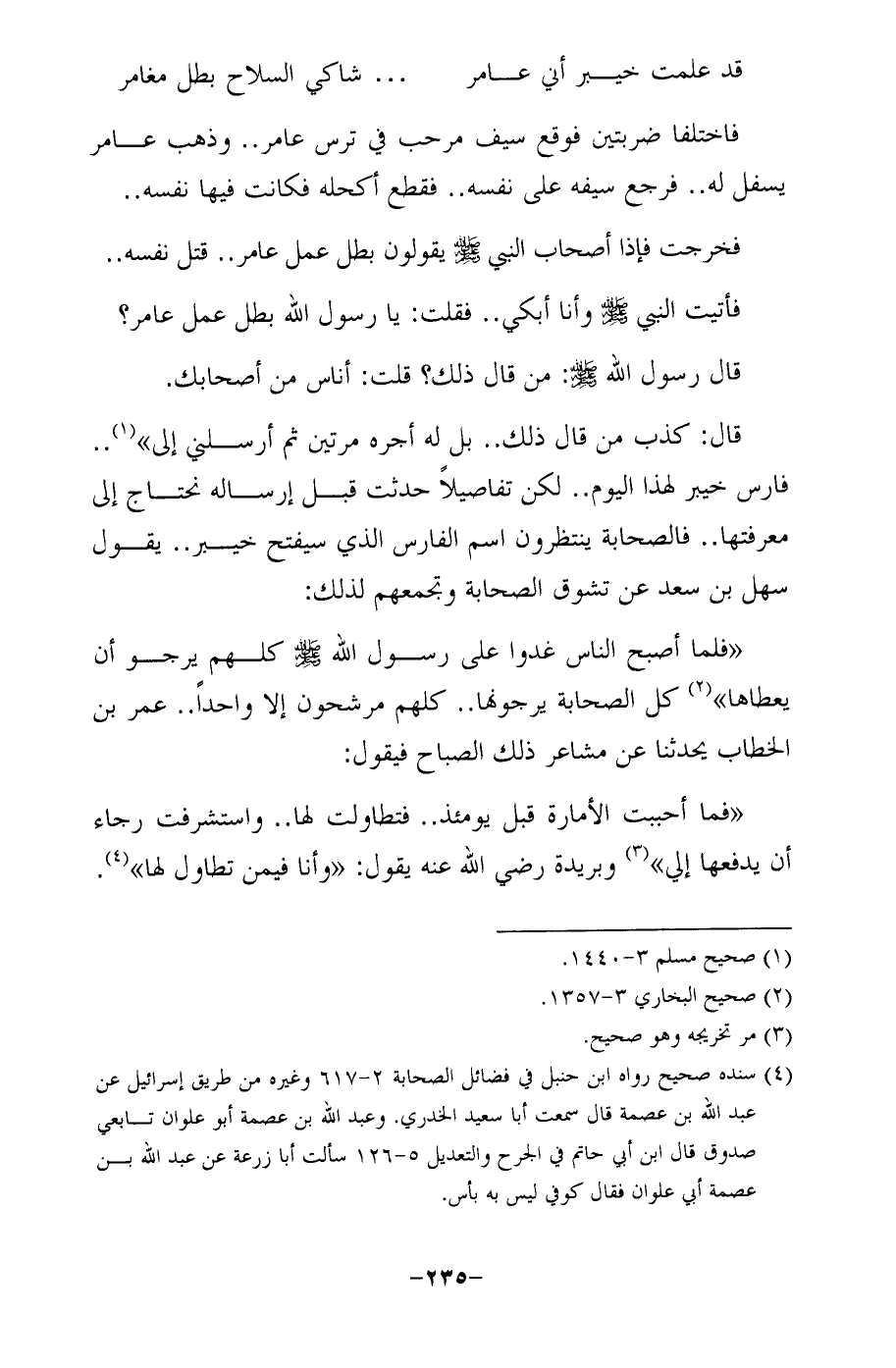 فخرجت فإذا أصحاب النبي - صلى الله عليه وسلم - يقولون بطل عمل عامر .. قتل نفسه ..