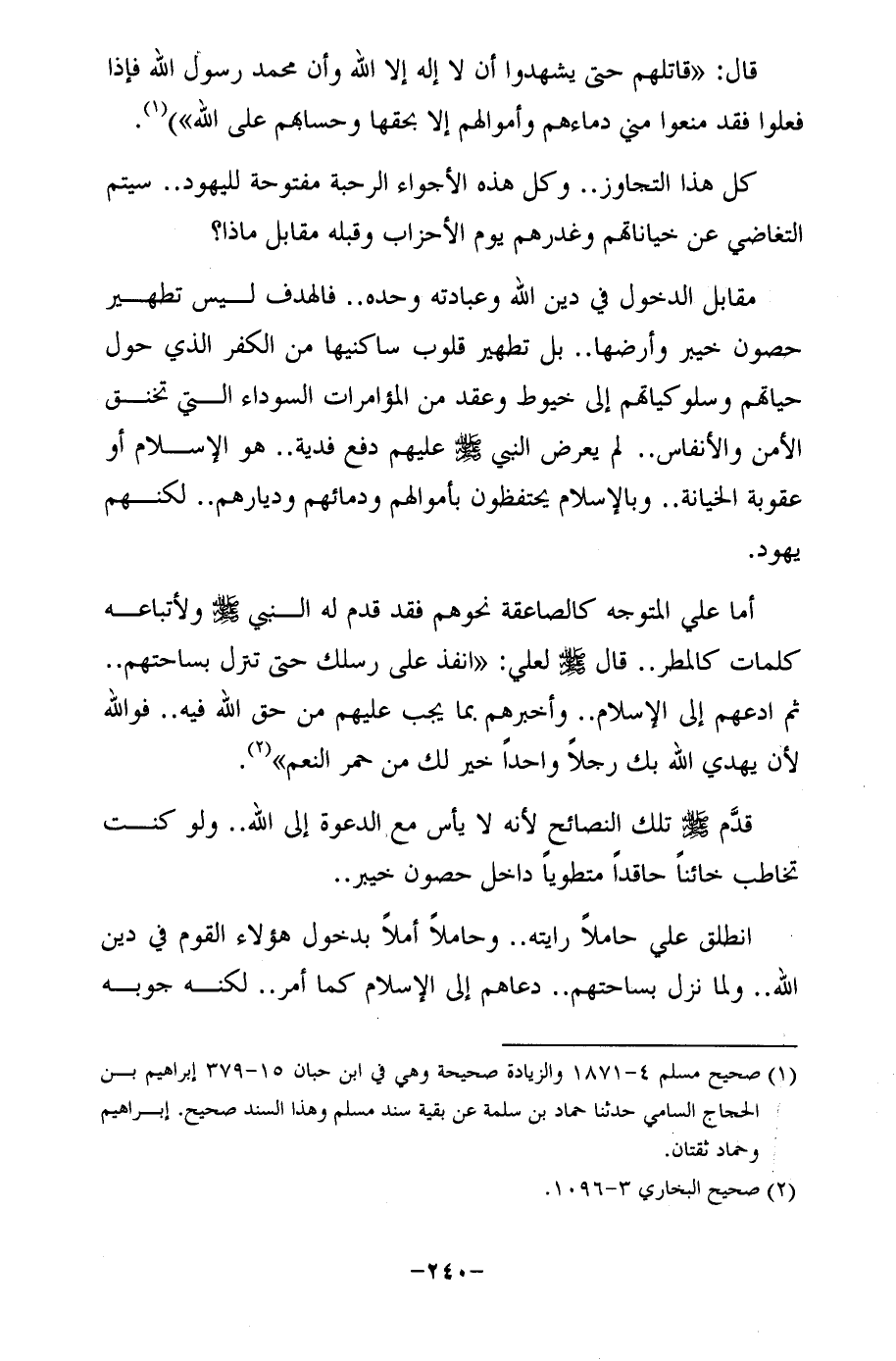مقابل الدخول في دين الله وعبادته وحده .. فالهدف ليس تطهير حصون خيبر وأرضها .. بل تطهير قلوب ساكنيها من الكفر الذي حول حياتهم وسلوكياتهم إلى خيوط وعقد من المؤامرات السوداء التي تخنق الأمن والأنفاس .. لم يعرض النبي - صلى الله عليه وسلم - عليهم دفع فدية .. هو الإِسلام أو عقوبة الخيانة .. وبالإِسلام يحتفظون بأموالهم ودمائهم وديارهم .. لكنهم يهود.