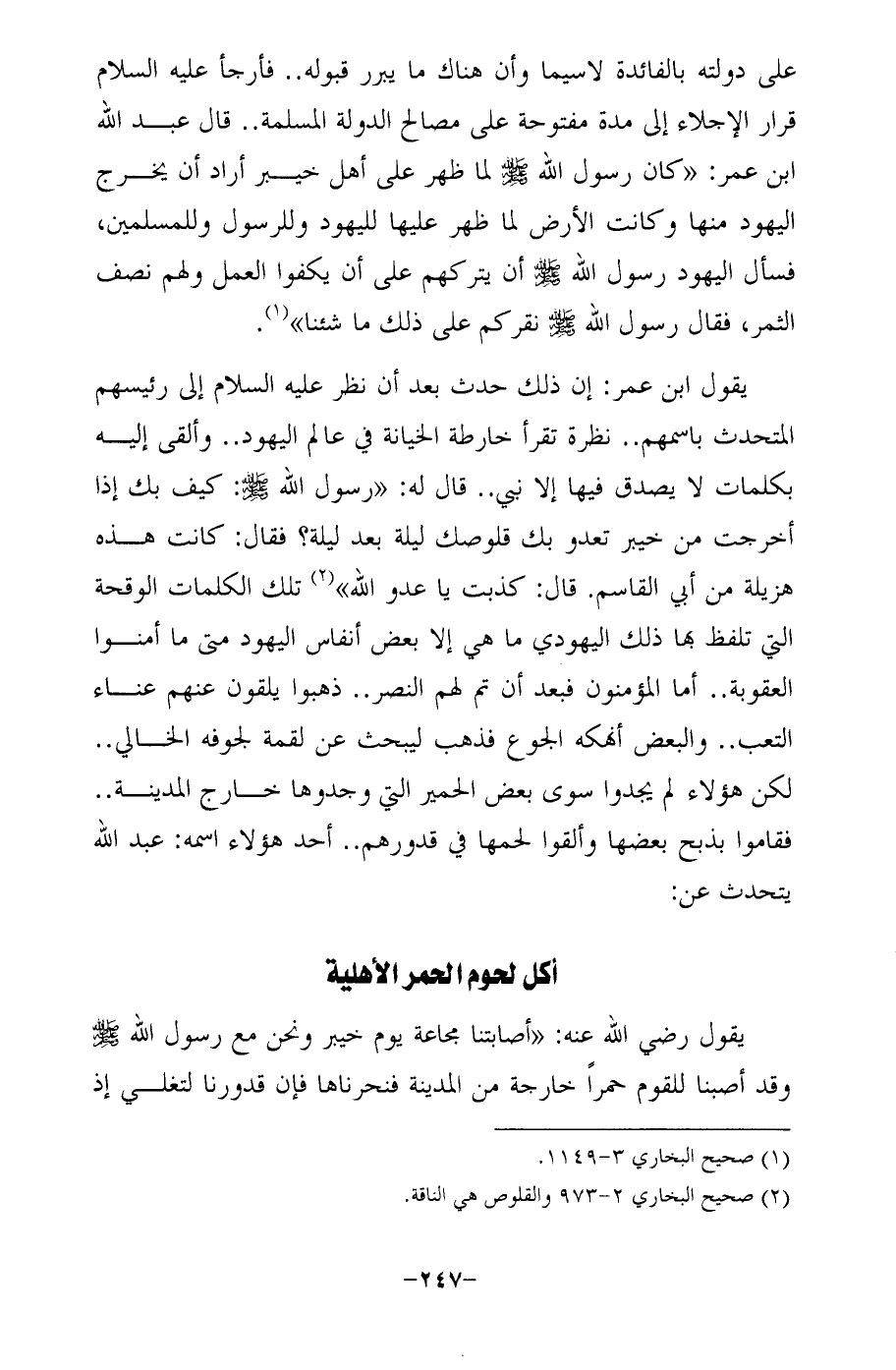 يقول ابن عمر: إن ذلك حدث بعد أن نظر عليه السلام إلى رئيسهم التحدث باسمهم .. نظرة تقرأ خارطة الخيانة في عالم اليهود .. وألقى إليه بكلمات لا يصدق فيها إلا نبي .. قال له: "رسول الله - صلى الله عليه وسلم -: كيف بك إذا أخرجت من خيبر تعدو بك قلوصك ليلة بعد ليلة؟ فقال: كانت هذه هزيلة من أبي القاسم. قال: كذبت يا عدو الله" (¬2) تلك الكلمات الوقحة التي تلفظ بها ذلك اليهودي ما هي إلا بعض أنفاس اليهود متى ما أمنوا العقوبة .. أما المؤمنون فبعد أن تم لهم النصر .. ذهبوا يلقون عنهم عناء التعب .. والبعض أنهكه الجوع فذهب ليبحث عن لقمة لجوفه الخالي .. لكن هؤلاء لم يجدوا سوى بعض الحمير التي وجدوها خارج المدينة .. فقاموا بذبح بعضها وألقوا لحمها في قدورهم .. أحد هؤلاء اسمه: عبد الله يتحدث عن: