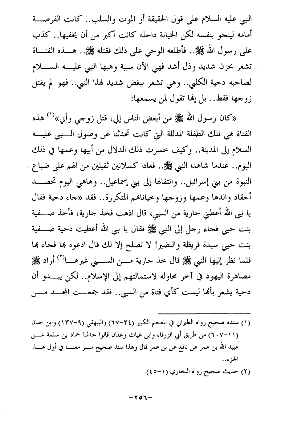 النبي عليه السلام على قول الحقيقة أو الموت والسلب .. كانت الفرصة أمامه لينجو بنفسه لكن الخيانة داخله كانت أكبر من أن يخفيها .. كذب على رسول الله - صلى الله عليه وسلم - .. فأطلعه الوحي على ذلك فقتله - صلى الله عليه وسلم - .. هذه الفتاة تشعر بحزن شديد وذل أشد فهي الآن سبية وهبها النبي عليه السلام لصاحبه دحية الكلبي .. وهي تشعر ببغض شديد لهذا النبي .. فهو لم يقتل زوجها فقط .. بل إنها تقول لمن يسمعها: