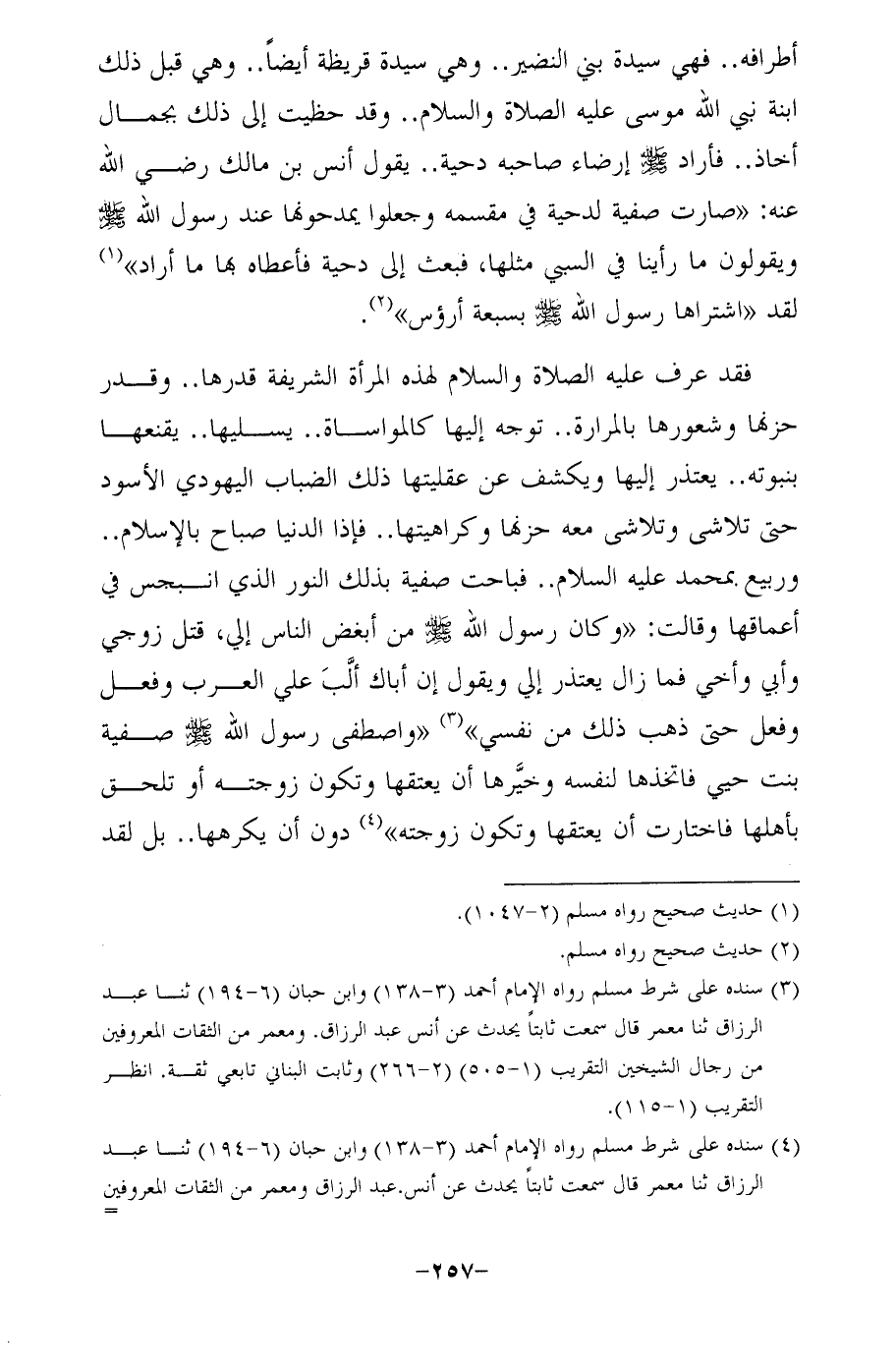 أطرافه .. فهي سيدة بني النضير .. وهي سيدة قريظة أيضًا .. وهي قبل ذلك ابنة نبي الله موسى عليه الصلاة والسلام .. وقد حظيت إلى ذلك بجمال أخاذ .. فأراد - صلى الله عليه وسلم - إرضاء صاحبه دحية .. يقول أنس بن مالك رضي الله عنه: "صارت صفية لدحية في مقسمه وجعلوا يمدحونها عند رسول الله - صلى الله عليه وسلم - ويقولون ما رأينا في السبي مثلها، فبعت إلى دحية فأعطاه بها ما أراد" (¬1) لقد "اشتراها رسول الله - صلى الله عليه وسلم - بسبعة أرؤس" (¬2).