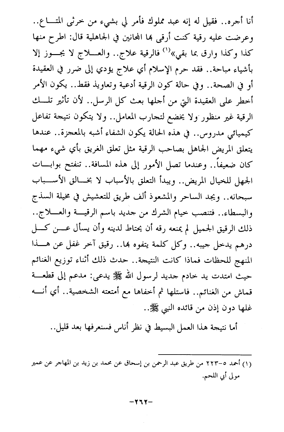 أو في الصحة .. وفي حالة كون الرقية أدعية وتعاويذ فقط .. يكون الأمر أخطر على العقيدة التي من أجلها بعث كل الرسل .. لأن تأثير تلك الرقية غير منظور ولا يخضع لتجارب المعامل .. ولا يتكون نتيجة تفاعل كيميائي مدروس .. في هذه الحالة يكون الشفاء أشبه بالمعجزة .. عندها يتعلق المريض الجاهل بصاحب الرقية مثل تعلق الغريق بأي شيء مهما كان ضعيفًا .. وعندما تصل الأمور إلى هذه المسافة .. تنفتح بوابات الجهل للخيال المريض .. ويبدأ التعلق بالأسباب لا بخالق الأسباب سبحانه .. ويجد الساحر والمشعوذ ألف طريق للتعشيش في مخيلة السذج والبسطاء .. فتنصب خيام الشرك من جديد باسم الرقية والعلاج .. ذلك الرقيق الجميل لم يمنعه رقه أن يحتاط لدينه وأن يسأل عن كل درهم يدخل جيبه .. وكل كلمة يتفوه بها .. رقيق آخر غفل عن هذا المنهج للحظات فماذا كانت النتيجة .. حدث ذلك أثناء توزيع الغنائم حيث امتدت يد خادم جديد لرسول الله - صلى الله عليه وسلم - يدعى: مدعم إلى قطعة قماش من الغنائم .. فاستلها ثم أخفاها مع أمتعته الشخصية .. أي أنه غلها دون إذن من قائده النبي - صلى الله عليه وسلم - ..