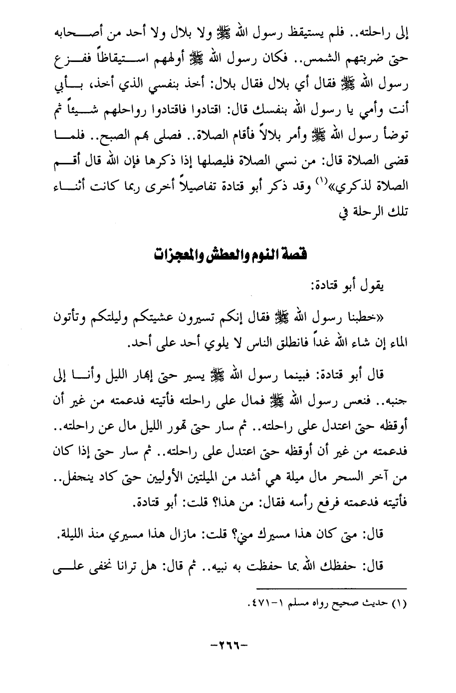 قال أبو قتادة: فبينما رسول الله - صلى الله عليه وسلم - يسير حتى إبهار الليل وأنا إلى جنبه .. فنعس رسول الله - صلى الله عليه وسلم - فمال على راحلته فأتيته فدعمته من غير أن أوقظه حتى اعتدل على راحلته .. ثم سار حتى تهور الليل مال عن راحلته .. فدعمته من غير أن أوقظه حتى اعتدل على راحلته .. ثم سار حتى إذا كان من آخر السحر مال ميلة هي أشد من الميلتين الأوليين حتى كاد ينجفل .. فأتيته فدعمته فرفع رأسه فقال: من هذا؟ قلت: أبو قتادة.