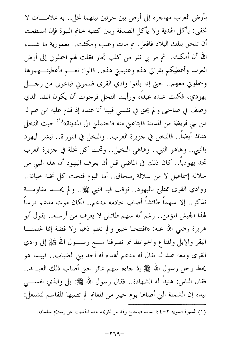 بأرض العرب مهاجره إلى أرض بين حرتين بينهما نخل .. به علامات لا تخفى: يأكل الهدية ولا يأكل الصدقة وبين كتفيه خاتم النبوة فإن استطعت أن تلحق بتلك البلاد فافعل. ثم مات وغيب ومكثت .. بعمورية ما شاء الله أن أمكث .. ثم مر بي نفر من كلب تجار فقلت لهم احملوني إلى أرض العرب وأعطيكم بقراتي هذه وغنيمتي هذه .. قالوا: نعم فأعطيتهموها وحملوني معهم .. حتى إذا بلغوا وادي القرى ظلموني فباعوني من رجل يهودي، فكنت عنده عبدًا، ورأيت النخل فرجوت أن يكون البلد الذي وصف لي صاحبي ولم يحق في نفسي فبينا أنا عنده إذ قدم عليه ابن عم له من بني قريظة من المدينة فابتاعني منه فاحتملني إلى المدينة" (¬1) حيث النخل هناك أيضًا .. فالنخل في جزيرة العرب .. والنخل في التوراة .. تبشر اليهود بالنبي .. وها هو النبي .. وها هي النخيل .. وتحت كل نخلة في جزيرة العرب تجد يهوديًا .. كان ذلك في الماضي قبل أن يعرف اليهود أن هذا النبي من سلالة إسماعيل لا من سلالة إسحاق .. أما اليوم فتحت كل نخلة خيانة .. ووادي القرى ممتلئ باليهود .. توقف فيه النبي - صلى الله عليه وسلم - .. ولم يجد مقاومة تذكر .. إلا سهمًا طائشًا أصاب خادمه مدعم .. فكان موت مدعم درسًا لهذا الجيش المؤمن .. رغم أنه سهم طائش لا يعرف من أرسله .. يقول أبو هريرة رضي الله عنه: "افتتحنا خيبر ولم نغنم ذهبًا ولا فضة إنما غنمنا البقر والإبل والمتاع والحوائط ثم انصرفنا مع رسول الله - صلى الله عليه وسلم - إلى وادي القرى ومعه عبد له يقال له مدعم أهداه له أحد بني الضباب .. فبينما هو يحط رحل رسول الله - صلى الله عليه وسلم - إذ جاءه سهم عائر حتى أصاب ذلك العبد .. فقال الناس: هنيئًا له الشهادة .. فقال رسول الله - صلى الله عليه وسلم -: بل والذي نفسي بيده إن الشملة التي أصابها يوم خيبر من المغانم لم تصبها المقاسم لتشتعل: