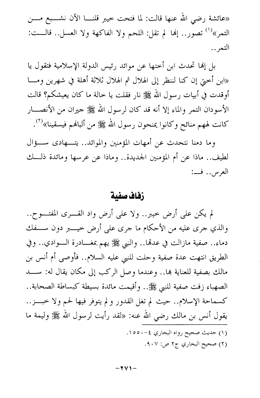 لم يكن على أرض خيبر .. ولا على أرض واد القرى المفتوح .. والذي جرى عليه من الأحكام ما جرى على أرض خيبر دون سفك دماء .. صفية ما زالت في عدتها .. والنبي - صلى الله عليه وسلم - يهم بمغادرة الوادي .. وفي الطريق انتهت عدة صفية وحلت للنبي عليه السلام .. فأوصى أم أنس بن مالك بصفية للعناية بها .. وعندما وصل الركب إلى مكان يقال له: سد الصهباء زفت صفية للنبي - صلى الله عليه وسلم - .. وأقيمت مائدة بسيطة كبساطة الصحابة .. كسماحة الإِسلام .. حيث لم تغل القدور ولم يتوفر فيها لحم ولا خبز .. يقول أنس بن مالك رضي الله عنه: "لقد رأيت لرسول الله - صلى الله عليه وسلم - وليمة ما