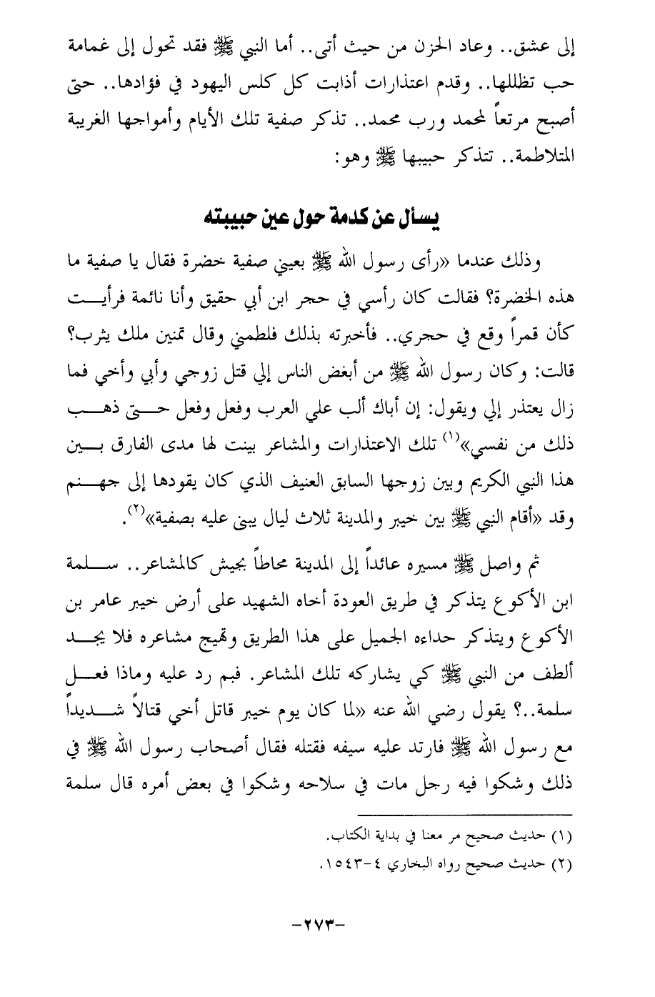 إلى عشق .. وعاد الحزن من حيث أتى .. أما النبي - صلى الله عليه وسلم - فقد تحول إلى غمامة حب تظللها .. وقدم اعتذارات أذابت كل كلس اليهود في فؤادها .. حتى أصبح مرتعًا لمحمد ورب محمَّد .. تذكر صفية تلك الأيام وأمواجها الغريبة المتلاطمة .. تتذكر حبيبها - صلى الله عليه وسلم - وهو: