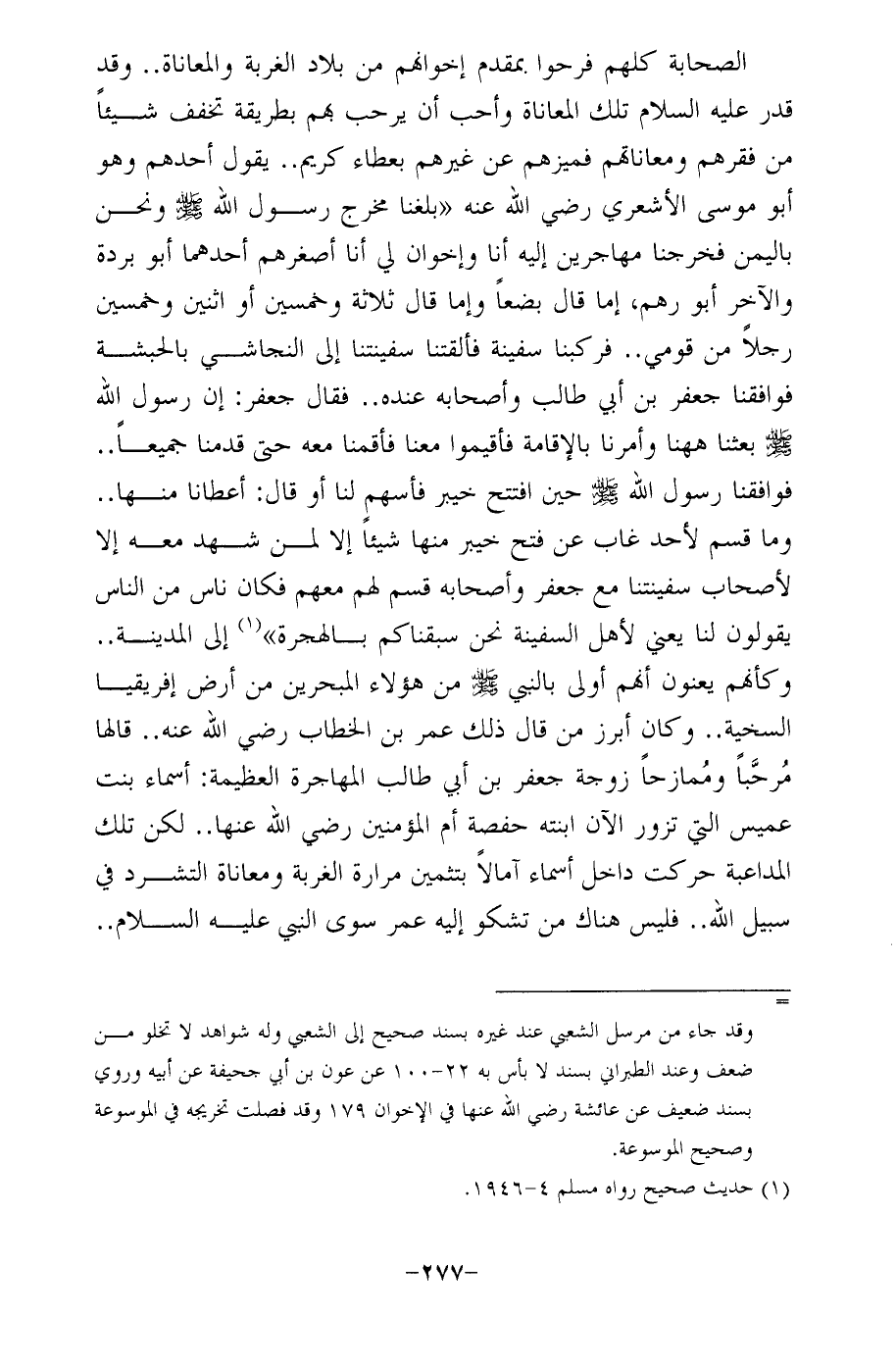 الصحابة كلهم فرحوا بمقدم إخوانهم من بلاد الغربة والمعاناة .. وقد قدر عليه السلام تلك المعاناة وأحب أن يرحب بهم بطريقة تخفف شيئًا من فقرهم ومعاناتهم فميزهم عن غيرهم بعطاء كريم .. يقول أحدهم وهو أبو موسى الأشعري رضي الله عنه "بلغنا مخرج رسول الله - صلى الله عليه وسلم - ونحن باليمن فخرجنا مهاجرين إليه أنا وإخوان لي أنا أصغرهم أحدهما أبو بردة والآخر أبو رهم، إما قال بضعًا وإما قال ثلاثة وخمسين أو اثنين وخمسين رجلًا من قومي .. فركبنا سفينة فألقتنا سفينتنا إلى النجاشى بالحبشة فوافقنا جعفر بن أبي طالب وأصحابه عنده .. فقال جعفر: إن رسول الله - صلى الله عليه وسلم - بعثنا ها هنا وأمرنا بالإقامة فأقيموا معنا فأقمنا معه حتى قدمنا جميعًا .. فوافقنا رسول الله - صلى الله عليه وسلم - حين افتتح خيبر فأسهم لنا أو قال: أعطانا منها .. وما قسم لأحد غاب عن فتح خيبر منها شيئًا إلا لمن شهد معه إلا لأصحاب سفينتنا مع جعفر وأصحابه قسم لهم معهم فكان ناس من الناس يقولون لنا يعني لأهل السفينة نحن سبقناكم بالهجرة" (¬1) إلى المدينة .. وكأنهم يعنون أنهم أولى بالنبي - صلى الله عليه وسلم - من هؤلاء المبحرين من أرض إفريقيا السخية .. وكان أبرز من قال ذلك عمر بن الخطاب رضي الله عنه .. قالها مُرحَّبًا ومُمازحًا زوجة جعفر بن أبي طالب المهاجرة العظيمة: أسماء بنت عميس التي تزور الآن ابنته حفصة أم المؤمنين رضي الله عنها .. لكن تلك المداعبة حركت داخل أسماء آمالًا بتثمين مرارة الغربة ومعاناة التشرد في سبيل الله .. فليس هناك من تشكو إليه عمر سوى النبي عليه السلام ..