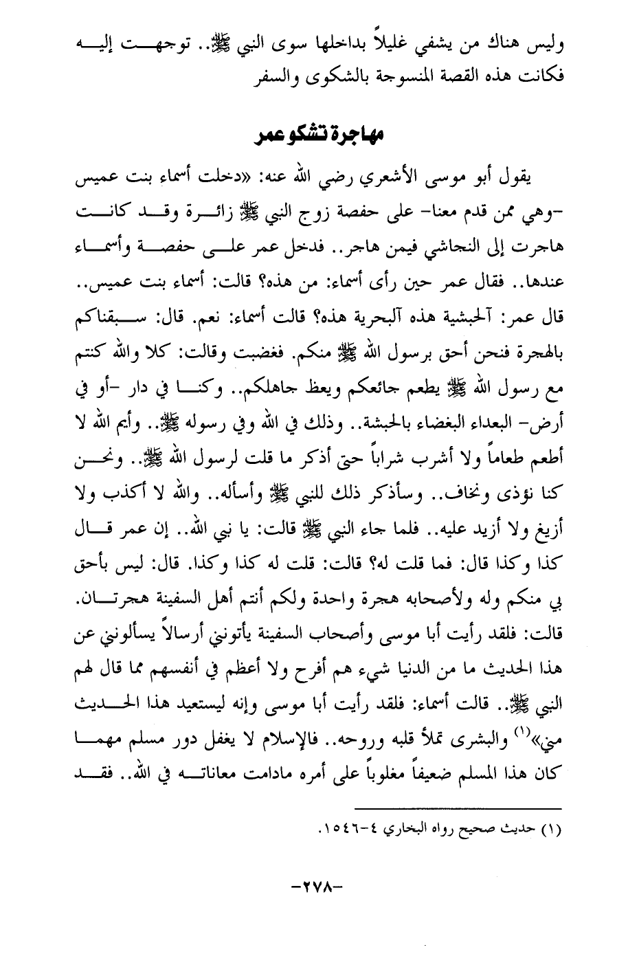 يقول أبو موسى الأشعري رضي الله عنه: "دخلت أسماء بنت عميس -وهي ممّن قدم معنا- على حفصة زوج النبي - صلى الله عليه وسلم - زائرة وقد كانت هاجرت إلى النجاشى فيمن هاجر .. فدخل عمر على حفصة وأسماء عندها .. فقال عمر حين رأى أسماء: من هذه؟ قالت: أسماء بنت عميس .. قال عمر: آلحبشية هذه آلبحرية هذه؟ قالت أسماء: نعم. قال: سبقناكم بالهجرة فنحن أحق برسول الله - صلى الله عليه وسلم - منكم. فغضبت وقالت: كلا والله كنتم مع رسول الله - صلى الله عليه وسلم - يطعم جائعكم ويعظ جاهلكم .. وكنا في دار -أو في أرض- البعداء البغضاء بالحبشة .. وذلك في الله وفي رسوله - صلى الله عليه وسلم - .. وأيم الله لا أطعم طعامًا ولا أشرب شرابًا حتى أذكر ما قلت لرسول الله - صلى الله عليه وسلم - .. ونحن كنا نؤذى ونخاف .. وسأذكر ذلك للنبي - صلى الله عليه وسلم - وأسأله .. والله لا أكذب ولا أزيغ ولا أزيد عليه .. فلما جاء النبي - صلى الله عليه وسلم - قالت: يا نبي الله .. إن عمر قال كذا وكذا قال: فما قلت له؟ قالت: قلت له كذا وكذا. قال: ليس بأحق بى منكم وله ولأصحابه هجرة واحدة ولكم أنتم أهل السفينة هجرتان. قالت: فلقد رأيت أبا موسى وأصحاب السفينة يأتونني أرسالًا يسألونني عن هذا الحديث ما من الدنيا شيء هم أفرح ولا أعظم في أنفسهم مما قال لهم النبي -صلى الله عليه وسلم- .. قالت أسماء: فلقد رأيت أبا موسى وإنه ليستعيد هذا الحديث منى" (¬1) والبشرى تملأ قلبه وروحه .. فالإِسلام لا يغفل دور مسلم مهما كان هذا المسلم ضعيفًا مغلوبًا على أمره مادامت معاناته في الله .. فقد