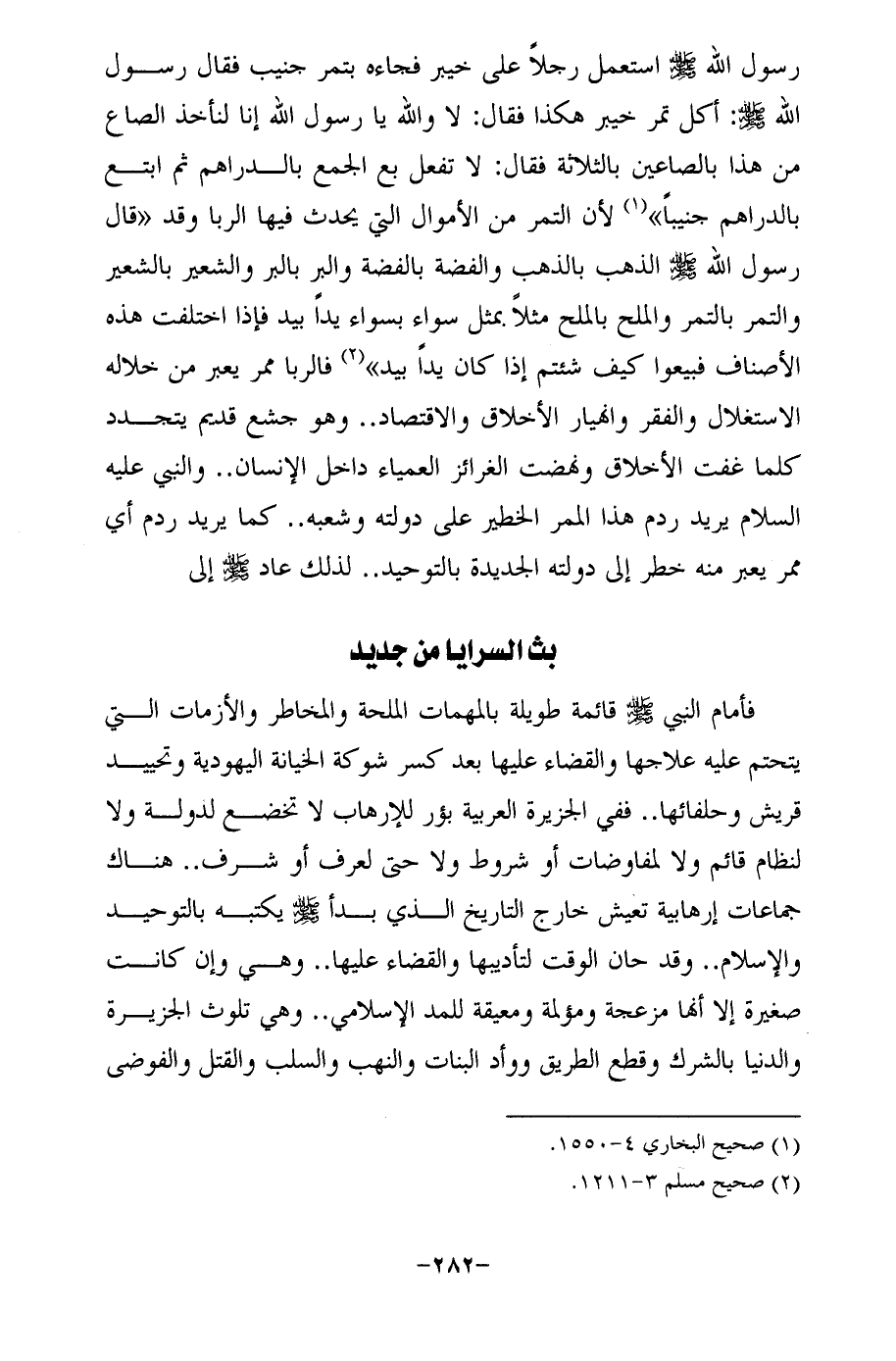 رسول الله - صلى الله عليه وسلم - استعمل رجلًا على خيبر فجاءه بتمر جنيب فقال رسول الله -صلى الله عليه وسلم-: أكل تمر خيبر هكذا فقال: لا والله يا رسول الله إنا لنأخذ الصاع من هذا بالصاعين بالثلاثة فقال: لا تفعل بع الجمع بالدراهم ثم ابتع بالدراهم جنيبًا" (¬1) لأن التمر من الأموال التي يحدث فيها الربا وقد "قال رسول الله - صلى الله عليه وسلم - الذهب بالذهب والفضة بالفضة والبر بالبر والشعير بالشعير والتمر بالتمر والملح بالملح مثلًا بمثل سواء بسواء يدًا بيد فإذا اختلفت هذه الأصناف فبيعوا كيف شئتم إذا كان يدًا بيد" (¬2) فالربا ممر يعبر من خلاله الاستغلال والفقر وانهيار الأخلاق والاقتصاد .. وهو جشع قديم يتجدد كلما غفت الأخلاق ونهضت الغرائز العمياء داخل الإنسان .. والنبي عليه السلام يريد ردم هذا الممر الخطير على دولته وشعبه .. كما يريد ردم أي ممر يعبر منه خطر إلى دولته الجديدة بالتوحيد .. لذلك عاد - صلى الله عليه وسلم - إلى