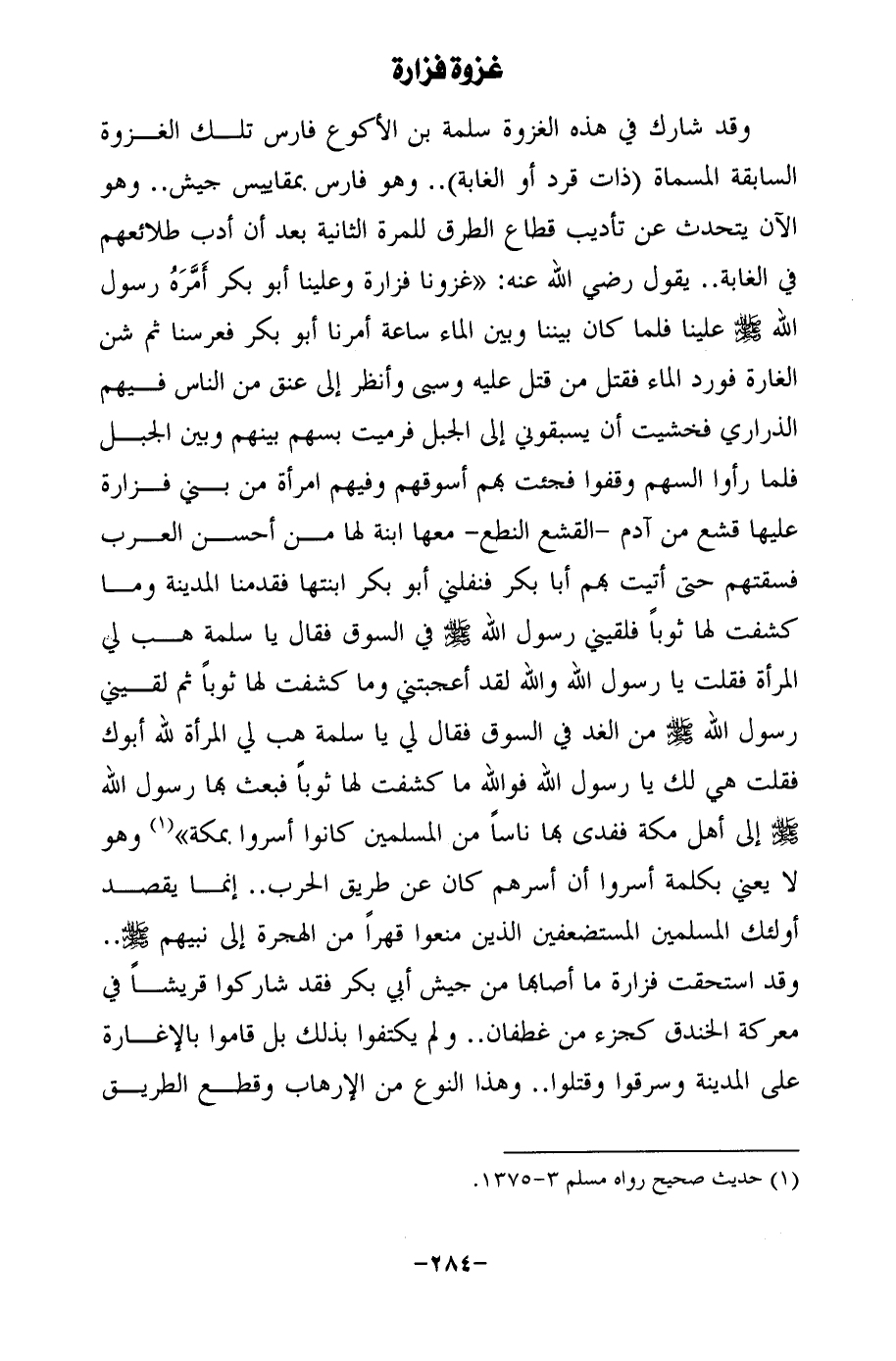 وقد شارك في هذه الغزوة سلمة بن الأكوع فارس تلك الغزوة السابقة المسماة (ذات قرد أو الغابة) .. وهو فارس بمقاييس جيش .. وهو الآن يتحدث عن تأديب قطاع الطرق للمرة الثانية بعد أن أدب طلائعهم في الغابة .. يقول رضي الله عنه: "غزونا فزارة وعلينا أبو بكر أَمَّرَهُ رسول الله -صلى الله عليه وسلم- علينا فلما كان بيننا وبين الماء ساعة أمرنا أبو بكر فعرسنا ثم شن الغارة فورد الماء فقتل من قتل عليه وسبى وأنظر إلى عنق من الناس فيهم الذراري فخشيت أن يسبقوني إلى الجبل فرميت بسهم بينهم وبين الجبل فلما رأوا السهم وقفوا فجئت بهم أسوقهم وفيهم امرأة من بنى فزارة عليها قشع من أدم -القشع النطع- معها ابنة لها من أحسن العرب فسقتهم حتى أتيت أبا بكر فنفلني أبو بكر ابنتها فقدمنا المدينة وما كشفت لها ثوبًا فلقيني رسول الله - صلى الله عليه وسلم - في السوق فقال يا سلمة هب لى المرأة فقلت يا رسول الله والله لقد أعجبتنى وما كشفت لها ثوبًا ثم لقيني رسول الله - صلى الله عليه وسلم - من الغد في السوق فقال لي يا سلمة هب لي المرأة لله أبوك فقلت هي لك يا رسول الله فوالله ما كشفت لها ثوبًا فبعث بها رسول الله - صلى الله عليه وسلم - إلى أهل مكة ففدى بها ناسًا من المسلمين كانوا أسروا بمكة" (¬1) وهو لا يعني بكلمة أسروا أن أسرهم كان عن طريق الحرب .. إنما يقصد أولئك المسلمين المستضعفين الذين منعوا قهرًا من الهجرة إلى نبيهم - صلى الله عليه وسلم - .. وقد استحقت فزارة ما أصابها من جيش أبي بكر فقد شاركوا قريشًا في معركة الخندق كجزء من غطفان .. ولم يكتفوا بذلك بل قاموا بالإغارة على المدينة وسرقوا وقتلوا .. وهذا النوع من الإرهاب وقطع الطريق