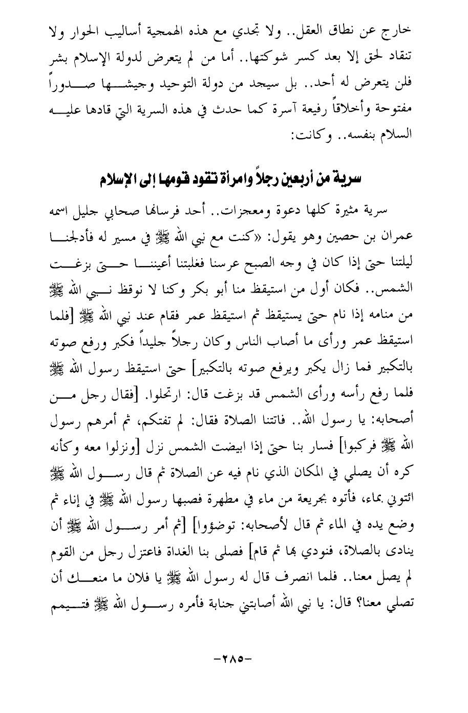 سرية مثيرة كلها دعوة ومعجزات .. أحد فرسانها صحابي جليل اسمه عمران بن حصين وهو يقول: "كنت مع نبي الله - صلى الله عليه وسلم - في مسير له فأدلجنا ليلتنا حتى إذا كان في وجه الصبح عرسنا فغلبتنا أعيننا حتى بزغت الشمس .. فكان أول من استيقظ منا أبو بكر وكنا لا نوقظ نبي الله - صلى الله عليه وسلم - من منامه إذا نام حتى يستيقظ ثم استيقظ عمر فقام عند نبي الله - صلى الله عليه وسلم -[فلما استيقظ عمر ورأى ما أصاب الناس وكان رجلًا جليدًا فكبر ورفع صوته بالتكبير فما زال يكبر ويرفع صوته بالتكبير] حتى استيقظ رسول الله - صلى الله عليه وسلم - فلما رفع رأسه ورأى الشمس قد بزغت قال: ارتحلوا. [فقال رجل من أصحابه: يا رسول الله .. فاتتنا الصلاة فقال: لم تفتكم، ثم أمرهم رسول الله -صلى الله عليه وسلم- فركبوا] فسار بنا حتى إذا ابيضت الشمس نزل [ونزلوا معه وكأنه كره أن يصلي في المكان الذي نام فيه عن الصلاة ثم قال رسول الله - صلى الله عليه وسلم - ائتوني بماء، فأتوه بجريعة من ماء في مطهرة فصبها رسول الله - صلى الله عليه وسلم - في إناء ثم وضع يده في الماء تم قال لأصحابه: توضؤوا] [ثم أمر رسول الله - صلى الله عليه وسلم - أن ينادى بالصلاة، فنودي بها ثم قام] فصلى بنا الغداة فاعتزل رجل من القوم لم يصل معنا .. فلما انصرف قال له رسول الله - صلى الله عليه وسلم - يا فلان ما منعك أن تصلى معنا؟ قال: يا نبي الله أصابتني جنابة فأمره رسول الله - صلى الله عليه وسلم - فتيمم