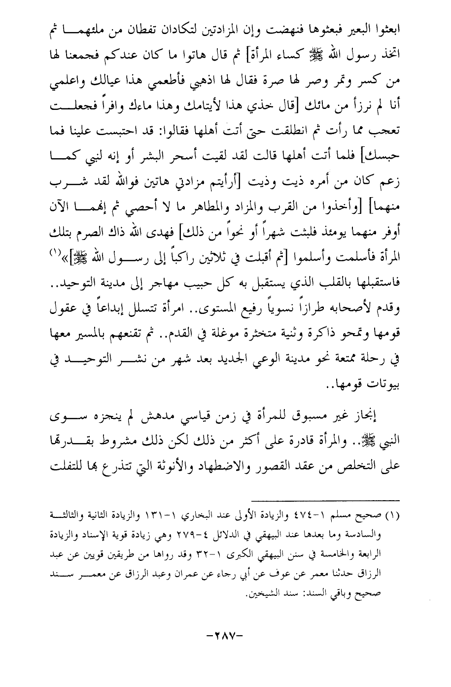 ابعثوا البعير فبعثوها فنهضت وإن المزادتين لتكادان تفطان من ملئهما ثم اتخذ رسول الله -صلى الله عليه وسلم- كساء المرأة] ثم قال هاتوا ما كان عندكم فجمعنا لها من كسر وتمر وصر لها صرة فقال لها اذهبي فأطعمى هذا عيالك واعلمي أنا لم نرزأ من مائك [قال خذي هذا لأيتامك وهذا ماءك وافرًا فجعلت تعجب مما رأت ثم انطلقت حتى أتت أهلها فقالوا: قد احتبست علينا فما حبسك] فلما أتت أهلها قالت لقد لقيت أسحر البشر أو إنه لنبي كما زعم كان من أمره ذيت وذيت [أرأيتم مزادتي هاتين فوالله لقد شرب منهما] [وأخذوا من القرب والمزاد والمطاهر ما لا أحصي ثم إنهما الآن أوفر منهما يومئذ فلبثت شهرًا أو نحوًا من ذلك] فهدى الله ذاك الصرم بتلك المرأة فأسلمت وأسلموا [ثم أقبلت في ثلاثين راكبًا إلى رسول الله - صلى الله عليه وسلم -] " (¬1) فاستقبلها بالقلب الذي يستقبل به كل حبيب مهاجر إلى مدينة التوحيد .. وقدم لأصحابه طرازًا نسويًا رفيع المستوى .. امرأة تتسلل إبداعًا في عقول قومها وتمحو ذاكرة وثنية متخثرة موغلة في القدم .. ثم تقنعهم بالمسير معها في رحلة ممتعة نحو مدينة الوعي الجديد بعد شهر من نشر التوحيد في بيوتات قومها ..