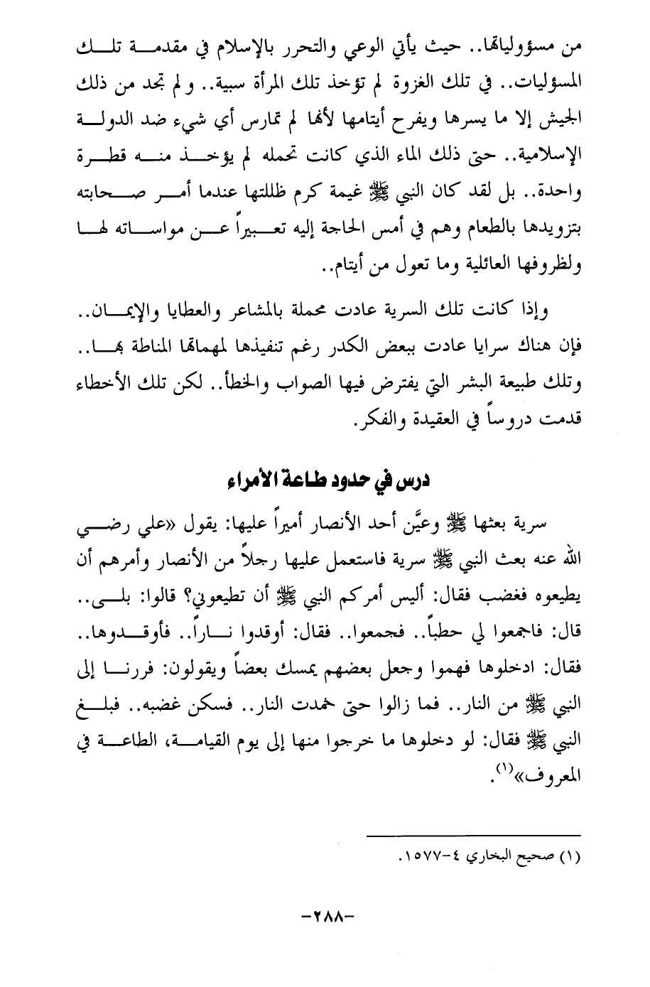 سرية بعثها -صلى الله عليه وسلم- وعيَّن أحد الأنصار أميرًا عليها: يقول "علي رضي الله عنه بعث النبي - صلى الله عليه وسلم - سرية فاستعمل عليها رجلًا من الأنصار وأمرهم أن يطيعوه فغضب فقال: أليس أمركم النبي - صلى الله عليه وسلم - أن تطيعوني؟ قالوا: بلى .. قال: فاجمعوا لي حطبًا .. فجمعوا .. فقال: أوقدوا نارًا .. فأوقدوها .. فقال: ادخلوها فهموا وجعل بعضهم يمسك بعضًا ويقولون: فررنا إلى النبي -صلى الله عليه وسلم- من النار .. فما زالوا حتى خمدت النار .. فسكن غضبه .. فبلغ النبي - صلى الله عليه وسلم - فقال: لو دخلوها ما خرجوا منها إلى يوم القيامة، الطاعة في المعروف" (¬1).
