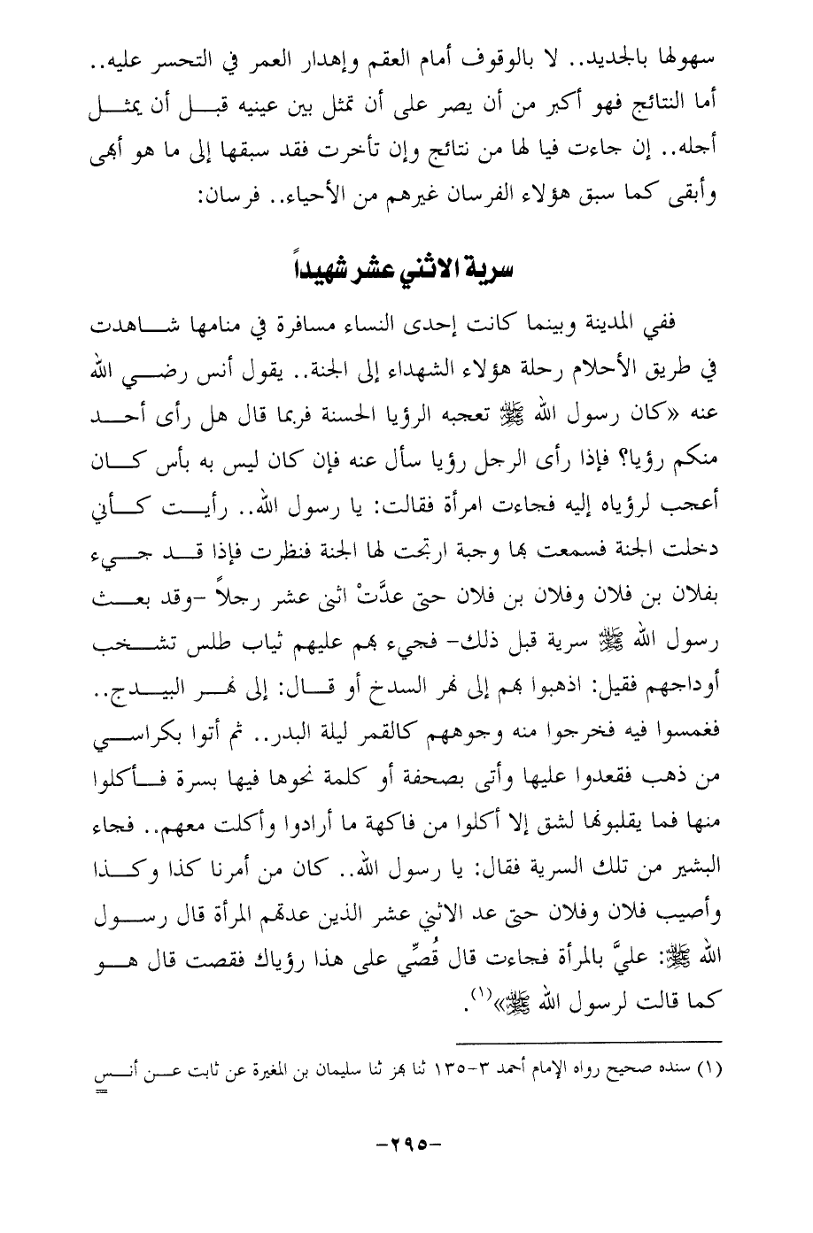ففي المدينة وبينما كانت إحدى النساء مسافرة في منامها شاهدت في طريق الأحلام رحلة هؤلاء الشهداء إلى الجنة .. يقول أنس رضي الله عنه "كان رسول الله - صلى الله عليه وسلم - تعجبه الرؤيا الحسنة فربما قال هل رأى أحد منكم رؤيا؟ فإذا رأى الرجل رؤيا سأل عنه فإن كان ليس به بأس كان أعجب لرؤياه إليه فجاءت امرأة فقالت: يا رسول الله .. رأيت كأني دخلت الجنة فسمعت بها وجبة ارتجت لها الجنة فنظرت فإذا قد جيء بفلان بن فلان وفلان بن فلان حتى عدَّتْ اثنى عشر رجلًا -وقد بعث رسول الله -صلى الله عليه وسلم- سرية قبل ذلك- فجيء بهم عليهم ثياب طلس تشخب أوداجهم فقيل: "اذهبوا بهم إلى نهر السدخ أو قال: إلى نهر البيدج .. فغمسوا فيه فخرجوا منه وجوههم كالقمر ليلة البدر .. ثم أتوا بكراسي من ذهب فقعدوا عليها وأتى بصحفة أو كلمة نحوها فيها بسرة فأكلوا منها فما يقلبونها لشق إلا أكلوا من فاكهة ما أرادوا وأكلت معهم .. فجاء البشير من تلك السرية فقال: يا رسول الله .. كان من أمرنا كذا وكذا وأصيب فلان وفلان حتى عد الاثني عشر الذين عدتهم المرأة قال رسول الله -صلى الله عليه وسلم-: عليَّ بالمرأة فجاءت قال قُصِّي على هذا رؤياك فقصت قال هو كما قالت لرسول الله -صلى الله عليه وسلم-) (¬1).