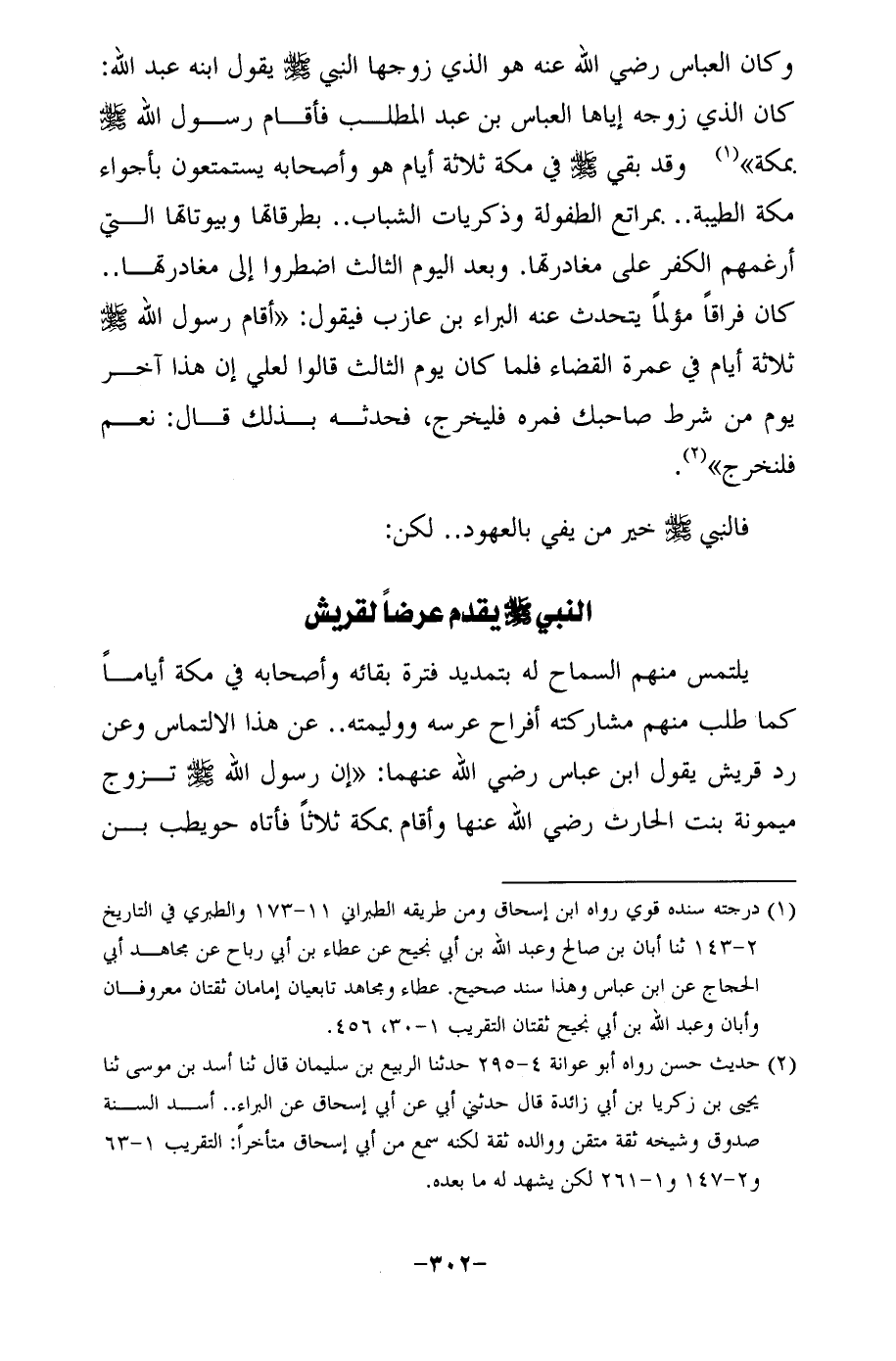 وكان العباس رضي الله عنه هو الذي زوجها النبي - صلى الله عليه وسلم - يقول ابنه عبد الله: كان الذي زوجه إياها العباس بن عبد المطلب فأقام رسول الله - صلى الله عليه وسلم - بمكة" (¬1) وقد بقي - صلى الله عليه وسلم - في مكة ثلاثة أيام هو وأصحابه يستمتعون بأجواء مكة الطيبة ... بمراتع الطفولة وذكريات الشباب .. بطرقاتها وبيوتاتها التي أرغمهم الكفر على مغادرتها. وبعد اليوم الثالث اضطروا إلى مغادرتها .. كان فراقًا مؤلمًا يتحدث عنه البراء بن عازب فيقول: "أقام رسول الله - صلى الله عليه وسلم - ثلاثة أيام في عمرة القضاء فلما كان يوم الثالث قالوا لعلي إن هذا آخر يوم من شرط صاحبك فمره فليخرج، فحدثه بذلك قال: نعم فلنخرج" (¬2).