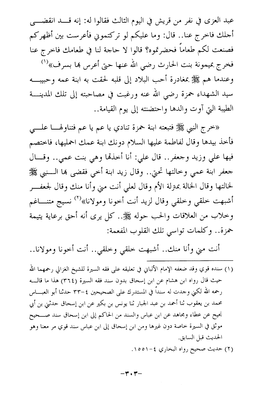 "خرج النبي - صلى الله عليه وسلم - فتبعته ابنة حمزة تنادي يا عم يا عم فتناولها علي فأخذ بيدها وقال لفاطمة عليها السلام دونك ابنة عمك احمليها، فاختصم فيها علي وزيد وجعفر .. قال علي: أنا أخذتها وهي بنت عمي .. وقال جعفر ابنة عمي وخالتها تحتي .. وقال زيد ابنة أخي فقضى بها النبي - صلى الله عليه وسلم - لخالتها وقال الخالة بمترلة الأم وقال لعلي أنت مني وأنا منك وقال لجعفر أشبهت خلقي وخلقي وقال لزيد أنت أخونا ومولانا" (¬2) نسيج متناغم وخلاب من العلاقات والحب حوله - صلى الله عليه وسلم - .. كل يرى أنه أحق برعاية يتيمة حمزة .. وكلمات تواسي تلك القلوب المفعمة: