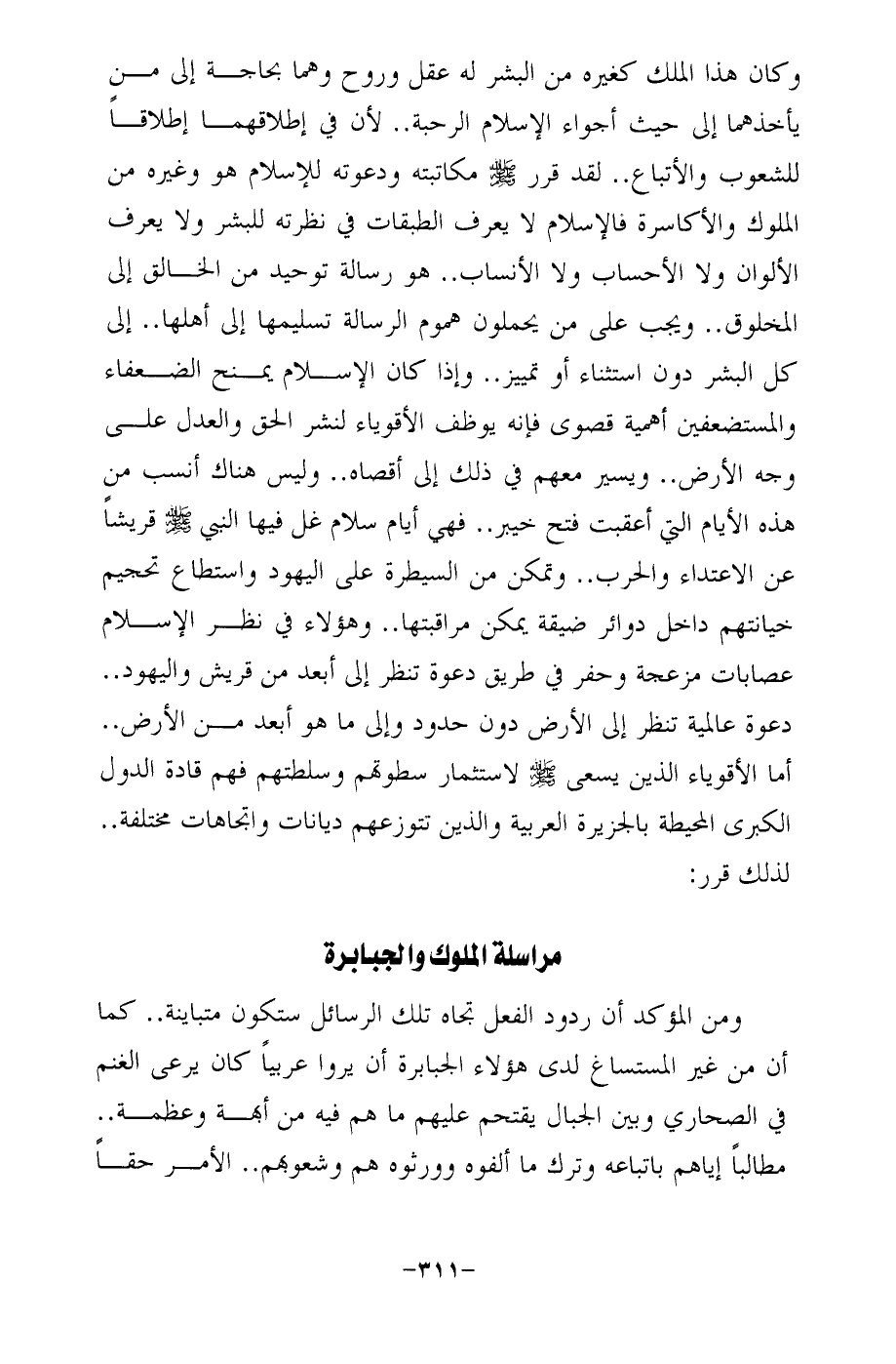 وكان هذا الملك كغيره من البشر له عقل وروح وهما بحاجة إلى من يأخذهما إلى حيث أجواء الإسلام الرحبة .. لأن في إطلاقهما إطلاقًا للشعوب والأتباع .. لقد قرر - صلى الله عليه وسلم - مكاتبته ودعوته للإسلام هو وغيره من الملوك والأكاسرة فالإسلام لا يعرف الطبقات في نظرته للبشر ولا يعرف الألوان ولا الأحساب ولا الأنساب .. هو رسالة توحيد من الخالق إلى المخلوق .. ويجب على من يحملون هموم الرسالة تسليمها إلى أهلها .. إلى كل البشر دون استثناء أو تمييز .. وإذا كان الإسلام يمنح الضعفاء والمستضعفين أهمية قصوى فإنه يوظف الأقوياء لنشر الحق والعدل على وجه الأرض. ويسير معهم في ذلك إلى أقصاه .. وليس هناك أنسب من هذه الأيام التي أعقبت فتح خيبر .. فهي أيام سلام غل فيها النبي - صلى الله عليه وسلم - قريشًا عن الاعتداء والحرب .. وتمكن من السيطرة على اليهود واستطاع تحجيم خيانتهم داخل دوائر ضيقة يمكن مراقبتها .. وهؤلاء في نظر الإِسلام عصابات مزعجة وحفر في طريق دعوة تنظر إلى أبعد من قريش واليهود .. دعوة عالمية تنظر إلى الأرض دون حدود وإلى ما هو أبعد من الأرض .. أما الأقوياء الذين يسعى - صلى الله عليه وسلم - لاستثمار سطوتهم وسلطتهم فهم قادة الدول الكبرى المحيطة بالجزيرة العربية والذين تتوزعهم ديانات واتجاهات مختلفة .. لذلك قرر: