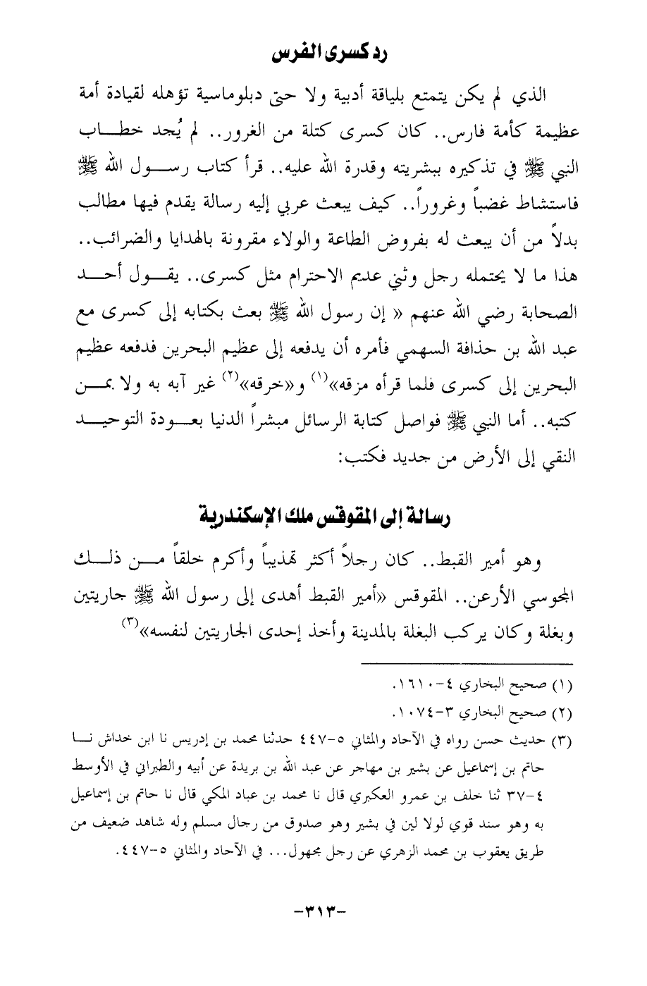 الذي لم يكن يتمتع بلياقة أدبية ولا حتى دبلوماسية تؤهله لقيادة أمة عظيمة كأمة فارس .. كان كسرى كتلة من الغرور .. لم يُجد خطاب النبي - صلى الله عليه وسلم - في تذكيره ببشريته وقدرة الله عليه .. قرأ كتاب رسول الله - صلى الله عليه وسلم - فاستشاط غضبًا وغرورًا .. كيف يبعث عربي إليه رسالة يقدم فيها مطالب بدلًا من أن يبعث له بفروض الطاعة والولاء مقرونة بالهدايا والضرائب .. هذا ما لا يحتمله رجل وثني عديم الاحترام مثل كسرى .. يقول أحد الصحابة رضي الله عنهم "إن رسول الله - صلى الله عليه وسلم - بعث بكتابه إلى كسرى مع عبد الله بن حذافة السهمي فأمره أن يدفعه إلى عظيم البحرين فدفعه عظيم البحرين إلى كسرى فلما قرأه مزقه" (¬1) و"خرقه" (¬2) غير آبه به ولا بمن كتبه .. أما النبي -صلى الله عليه وسلم- فواصل كتابة الرسائل مبشرًا الدنيا بعودة التوحيد النقي إلى الأرض من جديد فكتب: