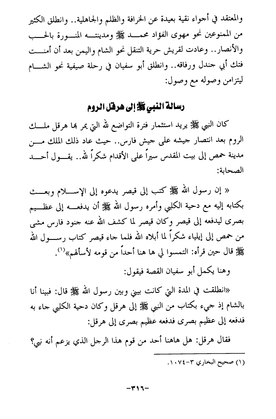 "إن رسول الله - صلى الله عليه وسلم - كتب إلى قيصر يدعوه إلى الإِسلام وبعث بكتابه إليه مع دحية الكلبي وأمره رسول الله -صلى الله عليه وسلم- أن يدفعه إلى عظيم بصرى ليدفعه إلى قيصر وكان قيصر لما كشف الله عنه جنود فارس مشى من حمص إلى إيلياء شكرًا لما أبلاه الله فلما جاء قيصر كتاب رسول الله - صلى الله عليه وسلم - قال حين قرأه: التمسوا لي ها هنا أحدًا من قومه لأسألهم" (¬1).