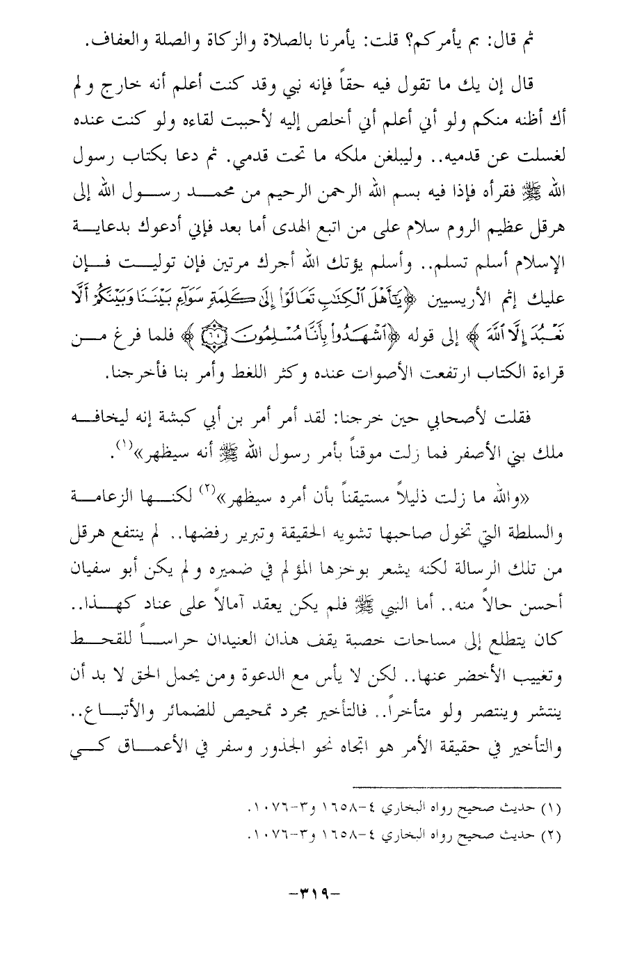 قال إن يك ما تقول فيه حقًا فإنه نبي وقد كنت أعلم أنه خارج ولم أك أظنه منكم ولو أني أعلم أني أخلص إليه لأحببت لقاءه ولو كنت عنده لغسلت عن قدميه .. وليبلغن ملكه ما تحت قدمي. ثم دعا بكتاب رسول الله -صلى الله عليه وسلم- فقرأه فإذا فيه بسم الله الرحمن الرحيم من محمَّد رسول الله إلى هرقل عظيم الروم سلام على من اتبع الهدى أما بعد فإني أدعوك بدعاية الإسلام أسلم تسلم .. وأسلم يؤتك الله أجرك مرتين فإن توليت فإن عليك إثم الأريسيين {يَا أَهْلَ الْكِتَابِ تَعَالَوْا إِلَى كَلِمَةٍ سَوَاءٍ بَيْنَنَا وَبَيْنَكُمْ أَلَّا نَعْبُدَ إِلَّا اللَّهَ} إلى قوله {اشْهَدُوا بِأَنَّا مُسْلِمُونَ (64)} فلما فرغ من قراءة الكتاب ارتفعت الأصوات عنده وكثر اللغط وأمر بنا فأخرجنا.