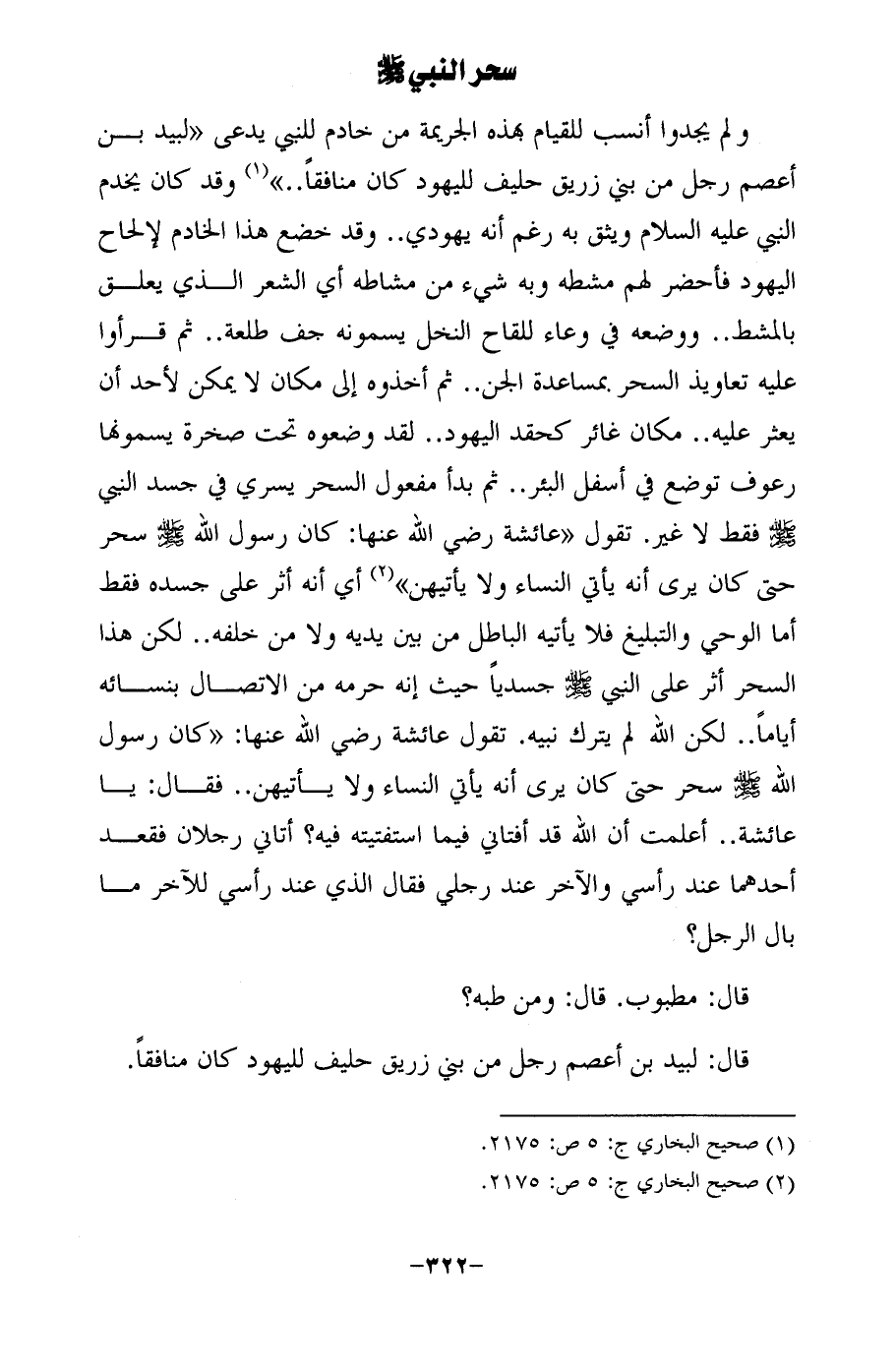 ولم يجدوا أنسب للقيام بهذه الجريمة من خادم للنبي يدعى "لبيد بن أعصم رجل من بني زريق حليف لليهود كان منافقًا .. " (¬1) وقد كان يخدم النبي عليه السلام ويثق به رغم أنه يهودي .. وقد خضع هذا الخادم لإلحاح اليهود فأحضر لهم مشطه وبه شيء من مشاطه أي الشعر الذي يعلق بالمشط .. ووضعه في وعاء للقاح النخل يسمونه جف طلعة .. ثم قرأوا عليه تعاويذ السحر بمساعدة الجن .. ثم أخذوه إلى مكان لا يمكن لأحد أن يعثر عليه .. مكان غائر كحقد اليهود .. لقد وضعوه تحت صخرة يسمونها رعوف توضع في أسفل البئر .. ثم بدأ مفعول السحر يسري في جسد النبي -صلى الله عليه وسلم- فقط لا غير. تقول "عائشة رضي الله عنها: كان رسول الله -صلى الله عليه وسلم- سحر حتى كان يرى أنه يأتي النساء ولا يأتيهن" (¬2) أي أنه أثر على جسده فقط أما الوحي والتبليغ فلا يأتيه الباطل من بين يديه ولا من خلفه .. لكن هذا السحر أثر على النبي -صلى الله عليه وسلم- جسديًا حيث إنه حرمه من الاتصال بنسائه أيامًا .. لكن الله لم يترك نبيه. تقول عائشة رضي الله عنها: "كان رسول الله -صلى الله عليه وسلم- سحر حتى كان يرى أنه يأتي النساء ولا يأتيهن .. فقال: يا عائشة .. أعلمت أن الله قد أفتاني فيما استفتيته فيه؟ أتاني رجلان فقعد أحدهما عند رأسي والآخر عند رجلي فقال الذي عند رأسي للآخر ما بال الرجل؟