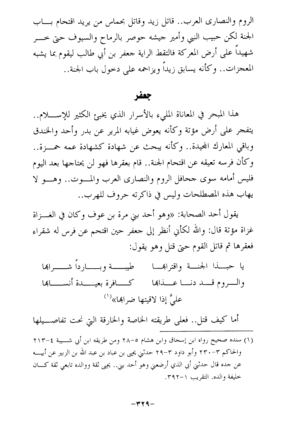 هذا المبحر في المعاناة المليء بالأسرار الذي يخبئ الكثير للإسلام .. يتفجر على أرض مؤتة وكأنه يعوض غيابه المرير عن بدر وأحد والخندق وباقي المعارك المجيدة .. وكأنه يبحث عن شهادة كشهادة عمه حمزة .. وكأن فرسه تعيقه عن اقتحام الجنة .. قام بعقرها فهو لن يحتاجها بعد اليوم فليس أمامه سوى جحافل الروم والنصارى العرب والموت .. وهو لا يهاب هذه المصطلحات وليس في ذاكرته حروف للهرب ..