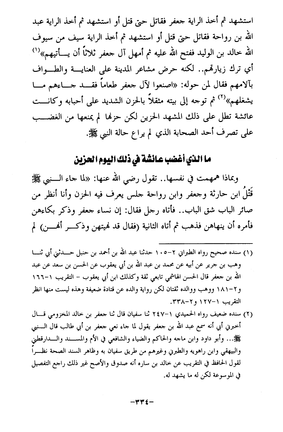وبماذا همهمت في نفسها .. تقول رضي الله عنها: "لما جاء النبي-صلى الله عليه وسلم- قَتْلُ ابن حارثة وجعفر وابن رواحة جلس يعرف فيه الحزن وأنا أنظر من صائر الباب شق الباب .. فأتاه رجل فقال: إن نساء جعفر وذكر بكاءهن فأمره أن ينهاهن فذهب ثم أتاه الثانية (فقال قد نهيتهن وذكر أنهن) لم