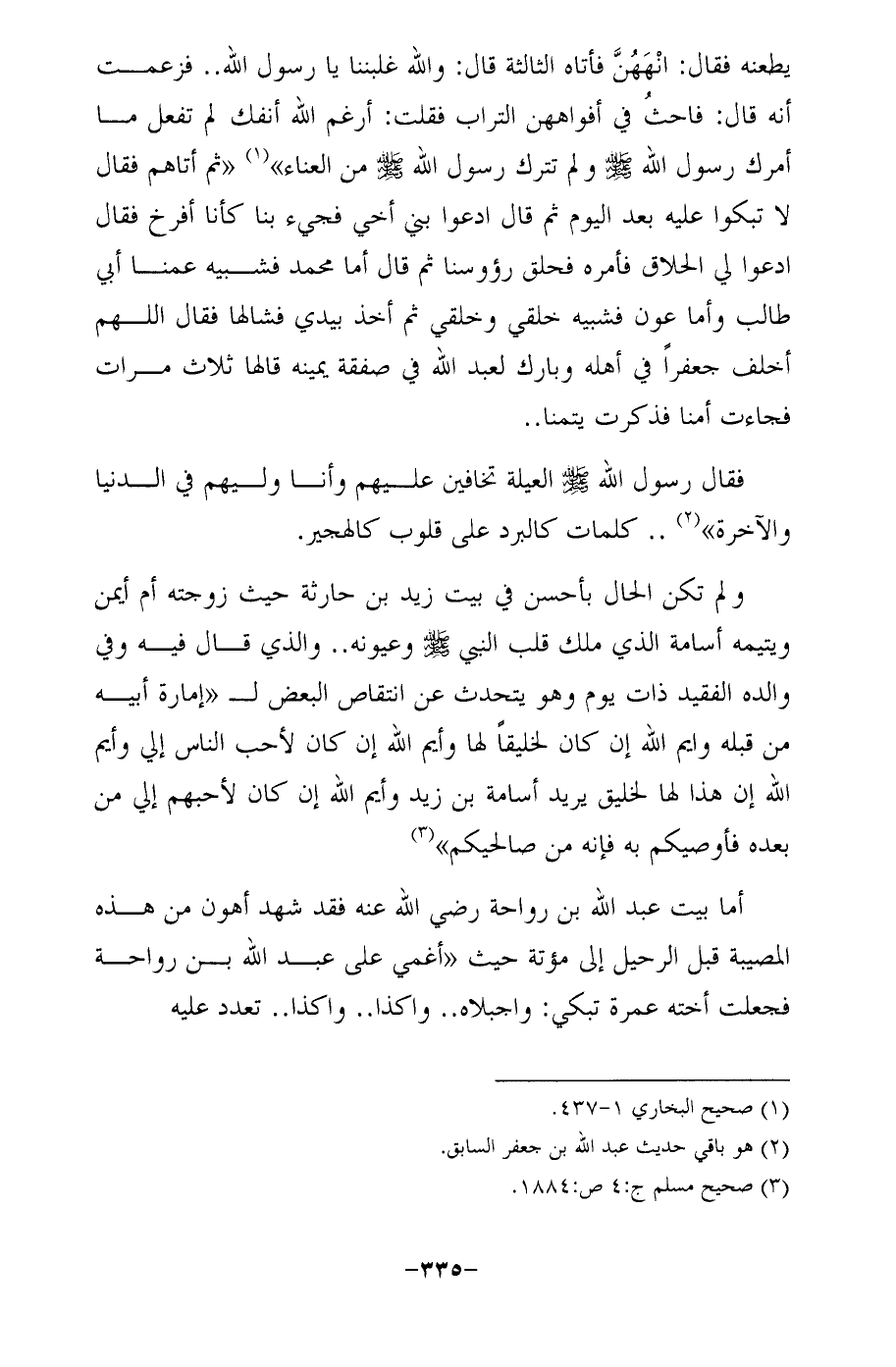 يطعنه فقال: انْهَهُنَّ فأتاه الثالثة قال: والله غلبننا يا رسول الله .. فزعمت أنه قال: فاحثُ في أفواههن التراب فقلت: أرغم الله أنفك لم تفعل ما أمرك رسول الله -صلى الله عليه وسلم- ولم تترك رسول الله -صلى الله عليه وسلم-من العناء" (¬1) "ثم أتاهم فقال لا تبكوا عليه بعد اليوم ثم قال ادعوا بني أخي فجيء بنا كأنا أفرخ فقال ادعوا لي الحلاق فأمره فحلق رؤوسنا ثم قال أما محمد فشبيه عمنا أبي طالب وأما عون فشبيه خلقي وخلقي ثم أخذ بيدي فشالها فقال اللَّهم أخلف جعفرًا في أهله وبارك لعبد الله في صفقة يمينه قالها ثلاث مرات فجاءت أمنا فذكرت يتمنا ..
