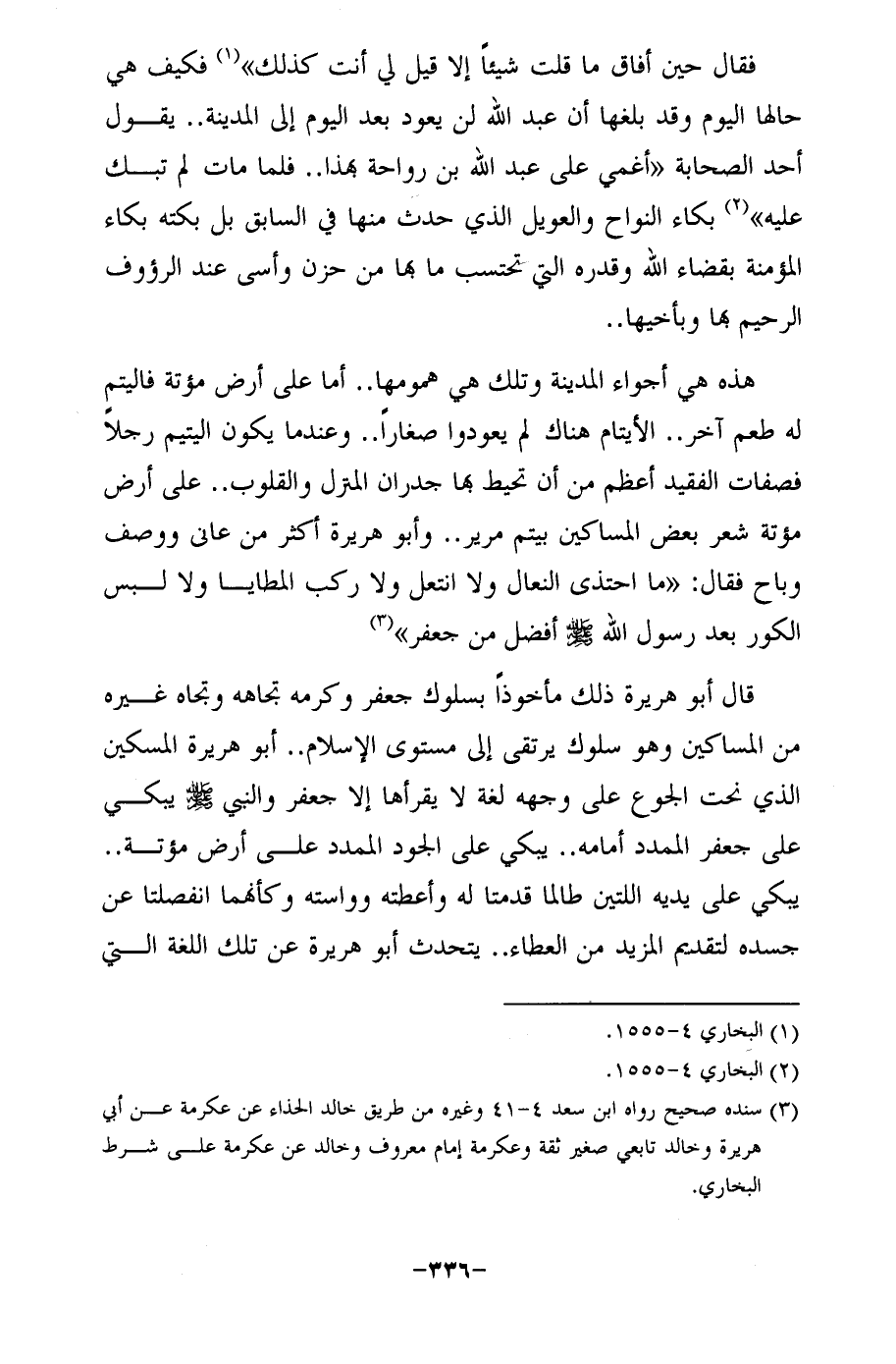 هذه هي أجواء المدينة وتلك هي همومها .. أما على أرض مؤتة فاليتم له طعم آخر .. الأيتام هناك لم يعودوا صغارًا .. وعندما يكون اليتيم رجلًا فصفات الفقيد أعظم من أن تحيط بها جدران المنزل والقلوب .. على أرض مؤتة شعر بعض المساكين بيتم مرير .. وأبو هريرة أكثر من عانى ووصف وباح فقال: "ما احتذى النعال ولا انتعل ولا ركب المطايا ولا لبس الكور بعد رسول الله -صلى الله عليه وسلم- أفضل من جعفر" (¬3)