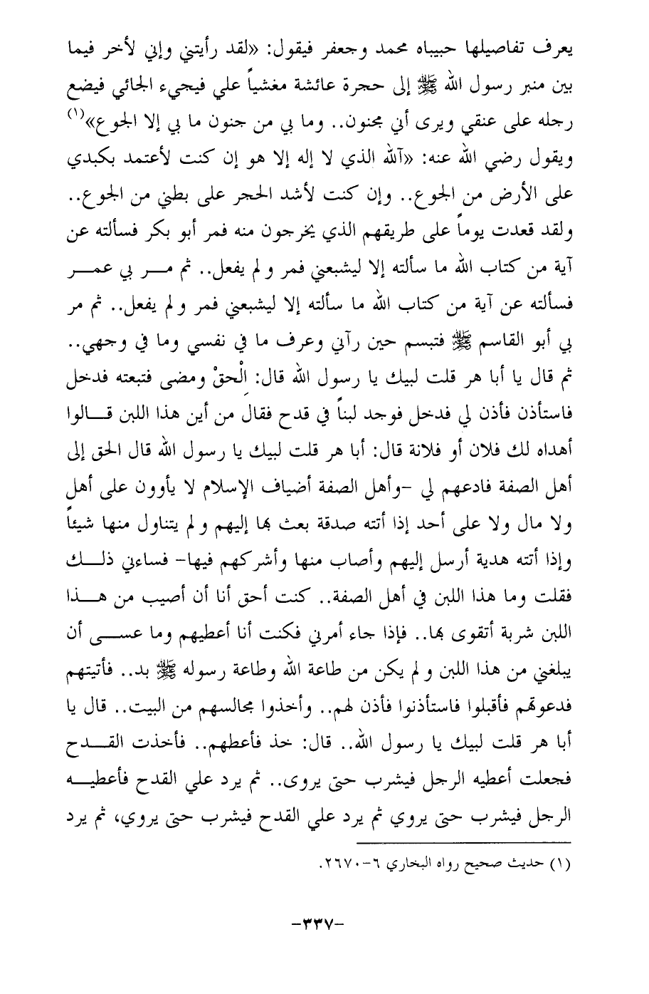 يعرف تفاصيلها حبيباه محمد وجعفر فيقول: "لقد رأيتني وإني لأخر فيما بين منبر رسول الله -صلى الله عليه وسلم- إلى حجرة عائشة مغشيًا علي فيجيء الجائي فيضع رجله على عنقي ويرى أني مجنون .. وما بي من جنون ما بي إلا الجوع" (¬1) ويقول رضي الله عنه: "آلله الذي لا إله إلا هو إن كنت لأعتمد بكبدي على الأرض من الجوع .. وإن كنت لأشد الحجر على بطني من الجوع .. ولقد قعدت يومًا على طريقهم الذي يخرجون منه فمر أبو بكر فسألته عن آية من كتاب الله ما سألته إلا ليشبعني فمر ولم يفعل .. ثم مر بي عمر فسألته عن آية من كتاب الله ما سألته إلا ليشبعني فمر ولم يفعل .. ثم مر بي أبو القاسم -صلى الله عليه وسلم- فتبسم حين رآني وعرف ما في نفسي وما في وجهي .. ثم قال يا أبا هر قلت لبيك يا رسول الله قال: الْحقْ ومضى فتبعته فدخل فاستأذن فأذن لي فدخل فوجد لبنًا في قدح فقال من أين هذا اللبن قالوا أهداه لك فلان أو فلانة قال: أبا هر قلت لبيك يا رسول الله قال الحق إلى أهل الصفة فادعهم لي -وأهل الصفة أضياف الإسلام لا يأوون على أهل ولا مال ولا على أحد إذا أتته صدقة بعث بها إليهم ولم يتناول منها شيئًا وإذا أتته هدية أرسل إليهم وأصاب منها وأشركهم فيها- فساءني ذلك فقلت وما هذا اللبن في أهل الصفة .. كنت أحق أنا أن أصيب من هذا اللبن شربة أتقوى بها .. فإذا جاء أمرني فكنت أنا أعطيهم وما عسى أن يبلغني من هذا اللبن ولم يكن من طاعة الله وطاعة رسوله -صلى الله عليه وسلم- بد .. فأتيتهم فدعوتهم فأقبلوا فاستأذنوا فأذن لهم .. وأخذوا مجالسهم من البيت .. قال يا أبا هر قلت لبيك يا رسول الله .. قال: خذ فأعطهم .. فأخذت القدح فجعلت أعطيه الرجل فيشرب حتى يروى .. ثم يرد علي القدح فأعطيه الرجل فيشرب حتى يروي ثم يرد علي القدح فيشرب حتى يروي، ثم يرد