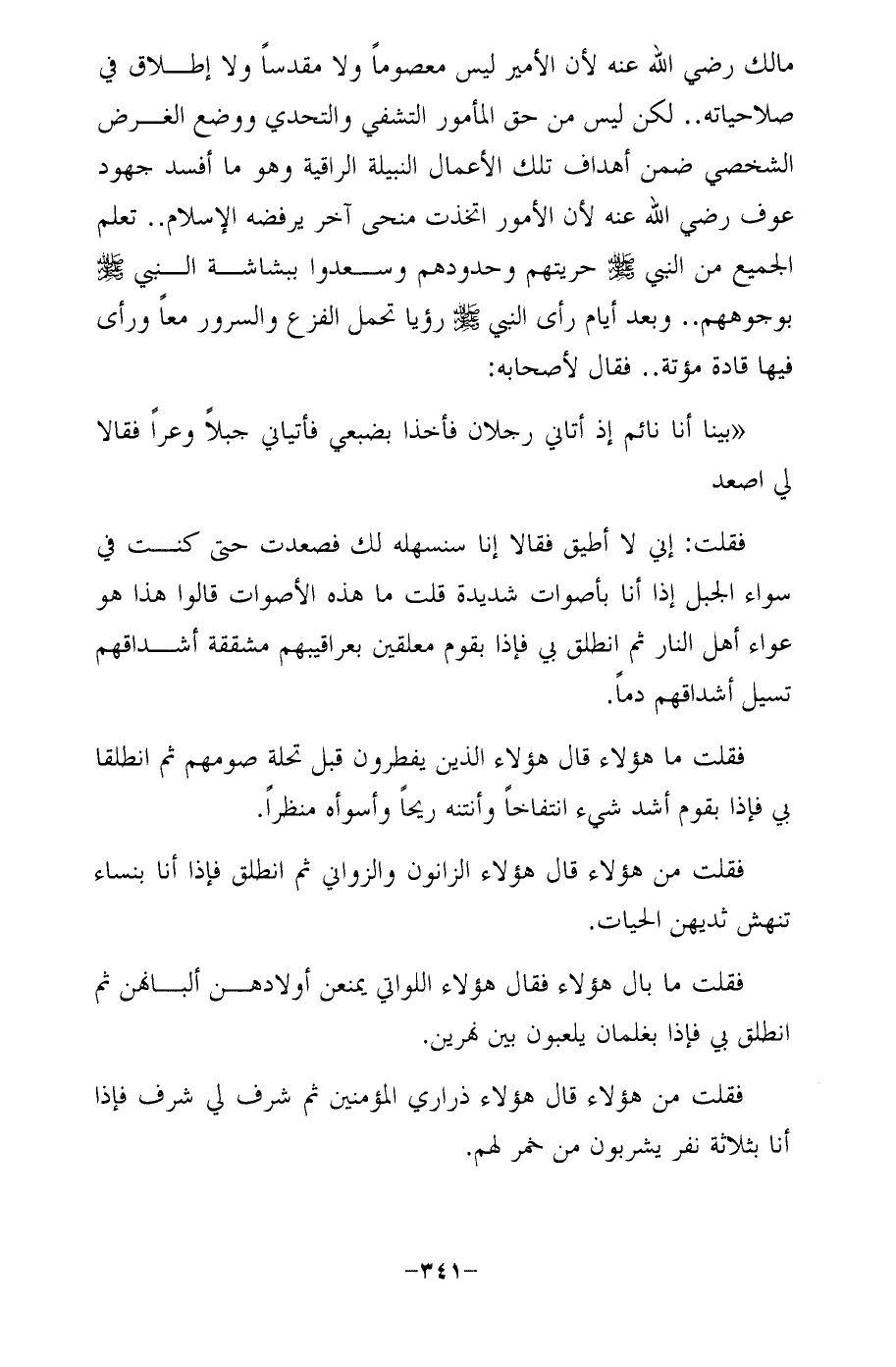 مالك رضي الله عنه لأن الأمير ليس معصومًا ولا مقدسًا ولا إطلاق في صلاحياته .. لكن ليس من حق المأمور التشفي والتحدي ووضع الغرض الشخصي ضمن أهداف تلك الأعمال النبيلة الراقية وهو ما أفسد جهود عوف رضي الله عنه لأن الأمور اتخذت منحى آخر يرفضه الإسلام .. تعلم الجميع من النبي -صلى الله عليه وسلم- حريتهم وحدودهم وسعدوا ببشاشة النبي-صلى الله عليه وسلم- بوجوههم .. وبعد أيام رأى النبي -صلى الله عليه وسلم- رؤيا تحمل الفزع والسرور معًا ورأى فيها قادة مؤتة .. فقال لأصحابه: