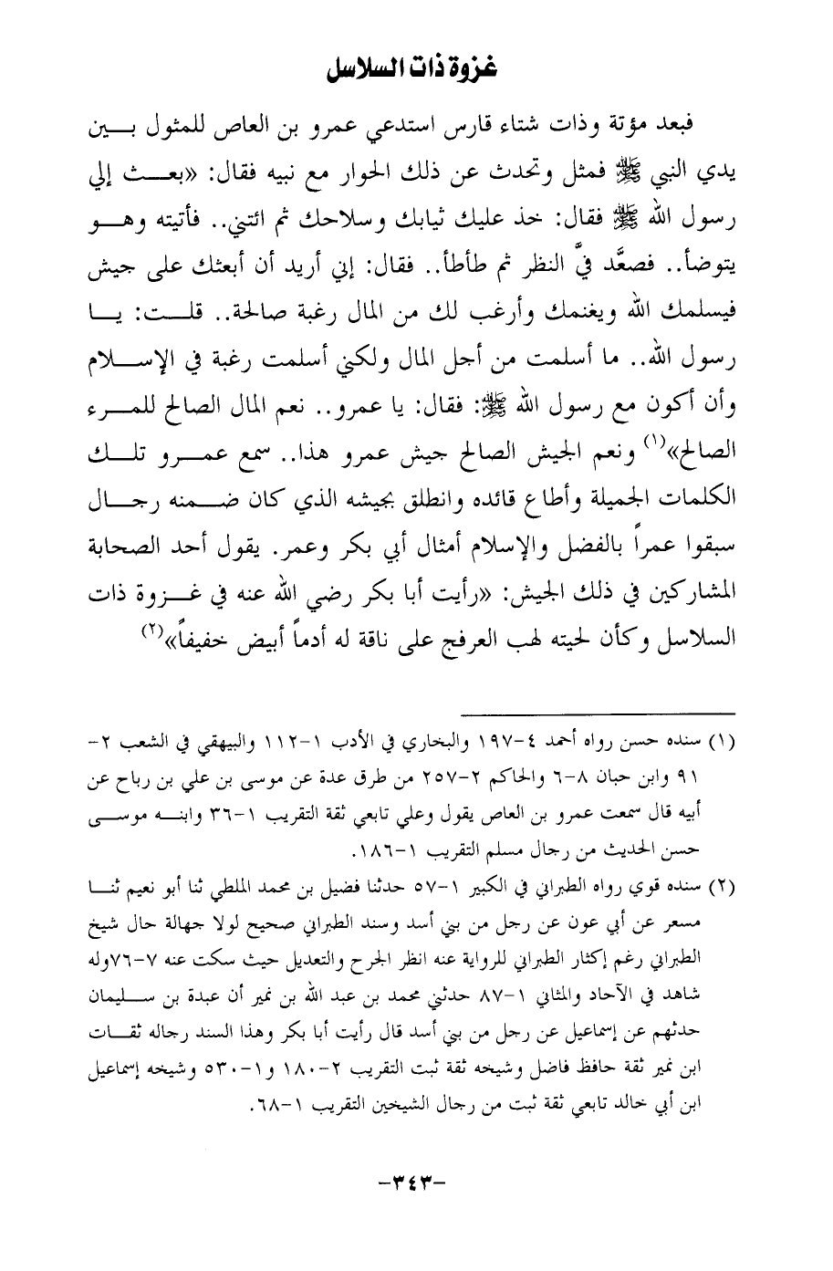 فبعد مؤتة وذات شتاء قارس استدعي عمرو بن العاص للمثول بين يدي النبي -صلى الله عليه وسلم- فمثل وتحدث عن ذلك الحوار مع نبيه فقال: "بعث إلى رسول الله - صلى الله عليه وسلم - فقال: خذ عليك ثيابك وسلاحك ثم ائتني .. فأتيته وهو يتوضأ .. فصعَّد فيَّ النظر ثم طأطأ .. فقال: إني أريد أن أبعثك على جيش فيسلمك الله ويغنمك وأرغب لك من المال رغبة صالحة .. قلت: يا رسول الله .. ما أسلمت من أجل المال ولكني أسلمت رغبة في الإسلام وأن أكون مع رسول الله -صلى الله عليه وسلم-: فقال: يا عمرو .. نعم المال الصالح للمرء الصالح" (¬1) ونعم الجيش الصالح جيش عمرو هذا .. سمع عمرو تلك الكلمات الجميلة وأطاع قائده وانطلق بجيشه الذي كان ضمنه رجال سبقوا عمرًا بالفضل والإسلام أمثال أبي بكر وعمر. يقول أحد الصحابة المشاركين في ذلك الجيش: "رأيت أبا بكر رضي الله عنه في غزوة ذات السلاسل وكأن لحيته لهب العرفج على ناقة له أدمًا أبيض خفيفًا" (¬2)
