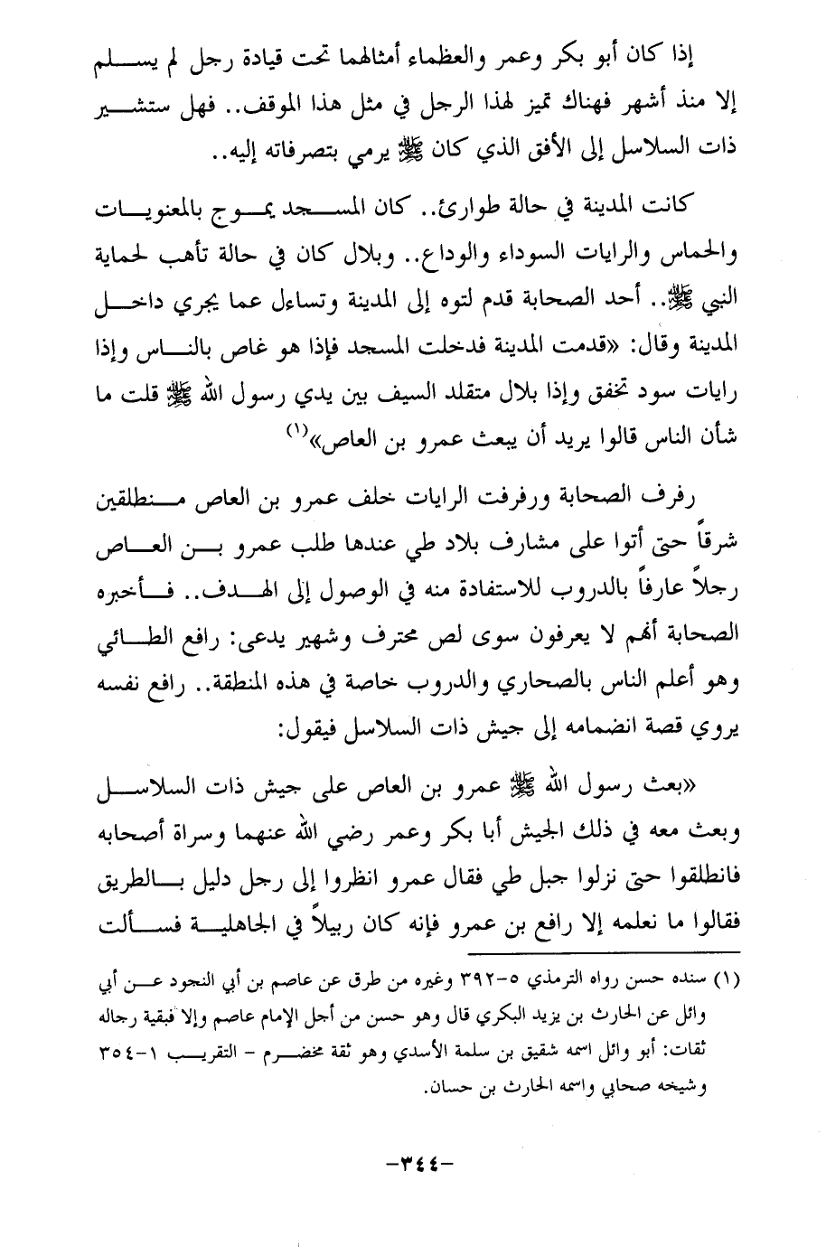 "بعث رسول الله -صلى الله عليه وسلم-عمرو بن العاص على جيش ذات السلاسل وبعث معه في ذلك الجيش أبا بكر وعمر رضي الله عنهما وسراة أصحابه فانطلقوا حتى نزلوا جبل طي فقال عمرو انظروا إلى رجل دليل بالطريق فقالوا ما نعلمه إلا رافع بن عمرو فإنه كان ربيلًا في الجاهلية فسألت