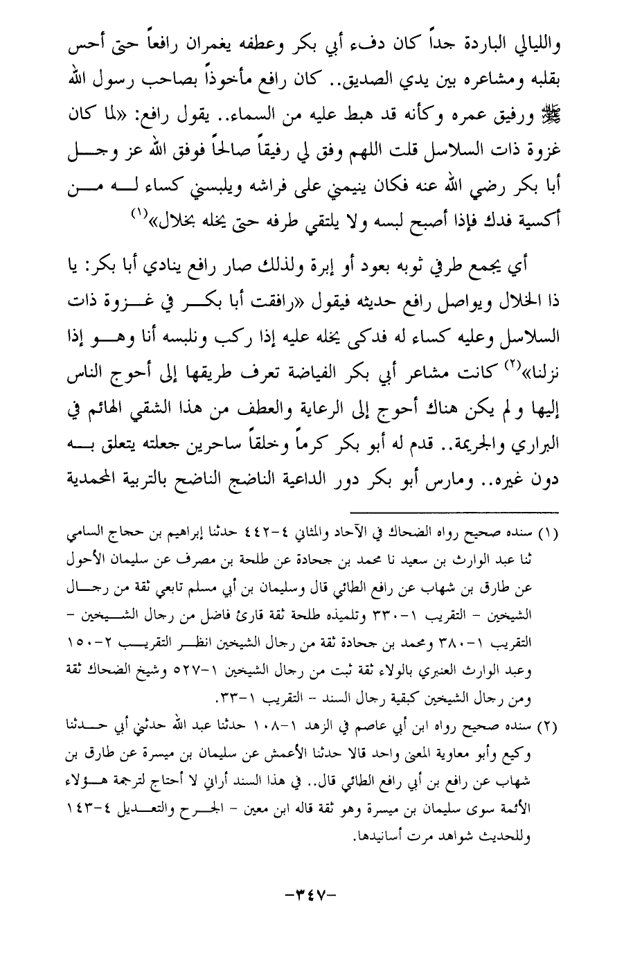 أي يجمع طرفي ثوبه بعود أو إبرة ولذلك صار رافع ينادي أبا بكر: يا ذا الخلال ويواصل رافع حديثه فيقول "رافقت أبا بكر في غزوة ذات السلاسل وعليه كساء له فدكى يخله عليه إذا ركب ونلبسه أنا وهو إذا نزلنا" (¬2) كانت مشاعر أبي بكر الفياضة تعرف طريقها إلى أحوج الناس إليها ولم يكن هناك أحوج إلى الرعاية والعطف من هذا الشقي الهائم في البراري والجريمة .. قدم له أبو بكر كرمًا وخلقًا ساحرين جعلته يتعلق به دون غيره .. ومارس أبو بكر دور الداعية الناضج بالتربية المحمدية
