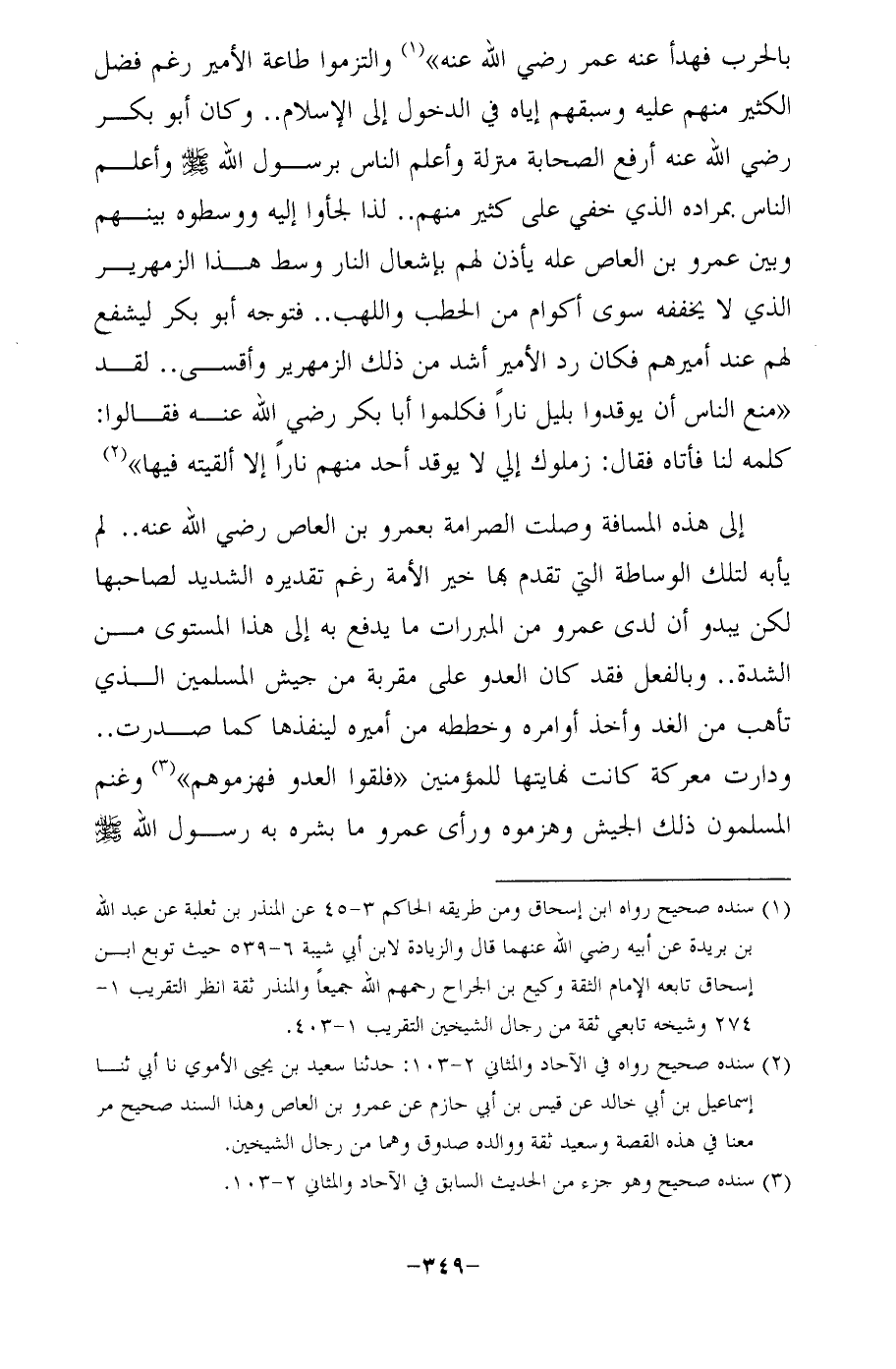 إلى هذه المسافة وصلت الصرامة بعمرو بن العاص رضي الله عنه .. لم يأبه لتلك الوساطة التي تقدم بها خير الأمة رغم تقديره الشديد لصاحبها لكن يبدو أن لدى عمرو من المبررات ما يدفع به إلى هذا المستوى من الشدة .. وبالفعل فقد كان العدو على مقربة من جيش المسلمين الذي تأهب من الغد وأخذ أوامره وخططه من أميره لينفذها كما صدرت .. ودارت معركة كانت نهايتها للمؤمنين "فلقوا العدو فهزموهم" (¬3) وغنم المسلمون ذلك الجيش وهزموه ورأى عمرو ما بشره به رسول الله - صلى الله عليه وسلم -