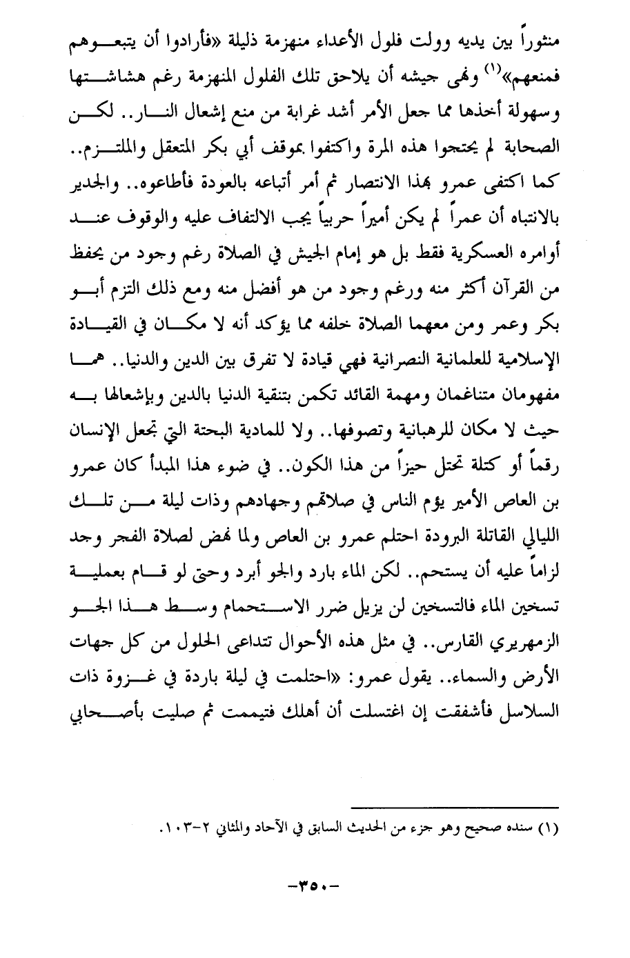 منثورًا بين يديه وولت فلول الأعداء منهزمة ذليلة "فأرادوا أن يتبعوهم فمنعهم" (¬1) ونهي جيشه أن يلاحق تلك الفلول المنهزمة رغم هشاشتها وسهولة أخذها مما جعل الأمر أشد غرابة من منع إشعال النار .. لكن الصحابة لم يحتجوا هذه المرة واكتفوا بموقف أبي بكر المتعقل والملتزم .. كما اكتفى عمرو بهذا الانتصار ثم أمر أتباعه بالعودة فأطاعوه .. والجدير بالانتباه أن عمرًا لم يكن أميرًا حربيًا يجب الالتفاف عليه والوقوف عند أوامره العسكرية فقط بل هو إمام الجيش في الصلاة رغم وجود من يحفظ من القرآن أكثر منه ورغم وجود من هو أفضل منه ومع ذلك التزم أبو بكر وعمر ومن معهما الصلاة خلفه مما يؤكد أنه لا مكان في القيادة الإسلامية للعلمانية النصرانية فهي قيادة لا تفرق بين الدين والدنيا .. هما مفهومان متناغمان ومهمة القائد تكمن بتنقية الدنيا بالدين وبإشعالها به حيث لا مكان للرهبانية وتصوفها .. ولا للمادية البحتة التي تجعل الإنسان رقمًا أو كتلة تحتل حيزًا من هذا الكون .. في ضوء هذا المبدأ كان عمرو بن العاص الأمير يؤم الناس في صلاتهم وجهادهم وذات ليلة من تلك الليالي القاتلة البرودة احتلم عمرو بن العاص ولما نهض لصلاة الفجر وجد لزامًا عليه أن يستحم .. لكن الماء بارد والجو أبرد وحتى لو قام بعملية تسخين الماء فالتسخين لن يزيل ضرر الاستحمام وسط هذا الجو الزمهريري القارس .. في مثل هذه الأحوال تتداعى الحلول من كل جهات الأرض والسماء .. يقول عمرو: "احتلمت في ليلة باردة في غزوة ذات السلاسل فأشفقت إن اغتسلت أن أهلك فتيممت ثم صليت بأصحابي