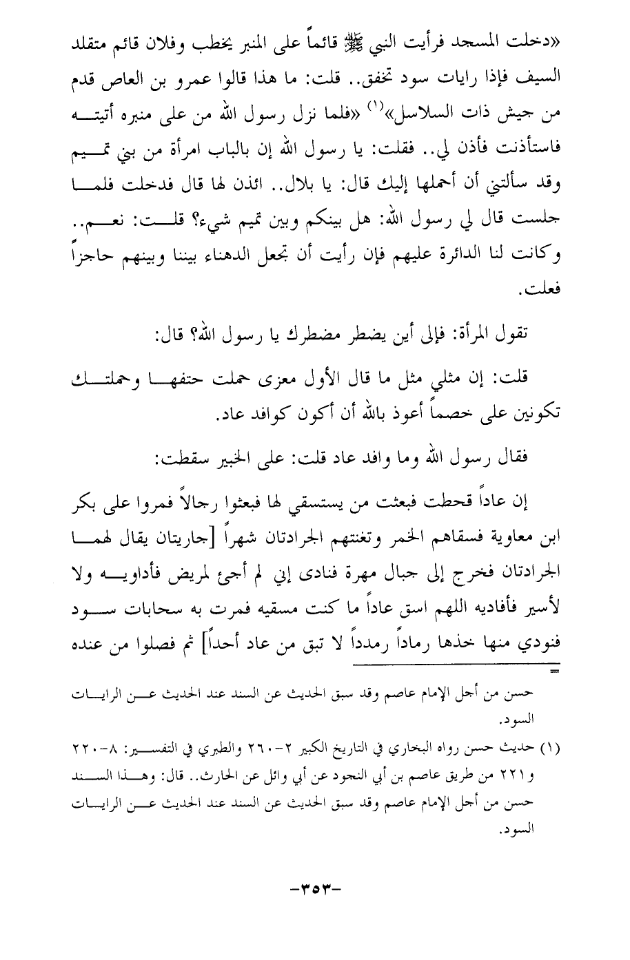 (¬1) حديثٌ حسنٌ رواه البخاري في التاريخ الكبير 2 - 260 والطبريُّ في التفسير: 8 - 220 و 221 من طريق عاصم بن أبي النجود عن أبي وائل عن الحارث .. قال: وهذا السند حسن من أجل الإمام عاصم وقد سبق الحديث عن السند عند الحديث عن الرايات السود.