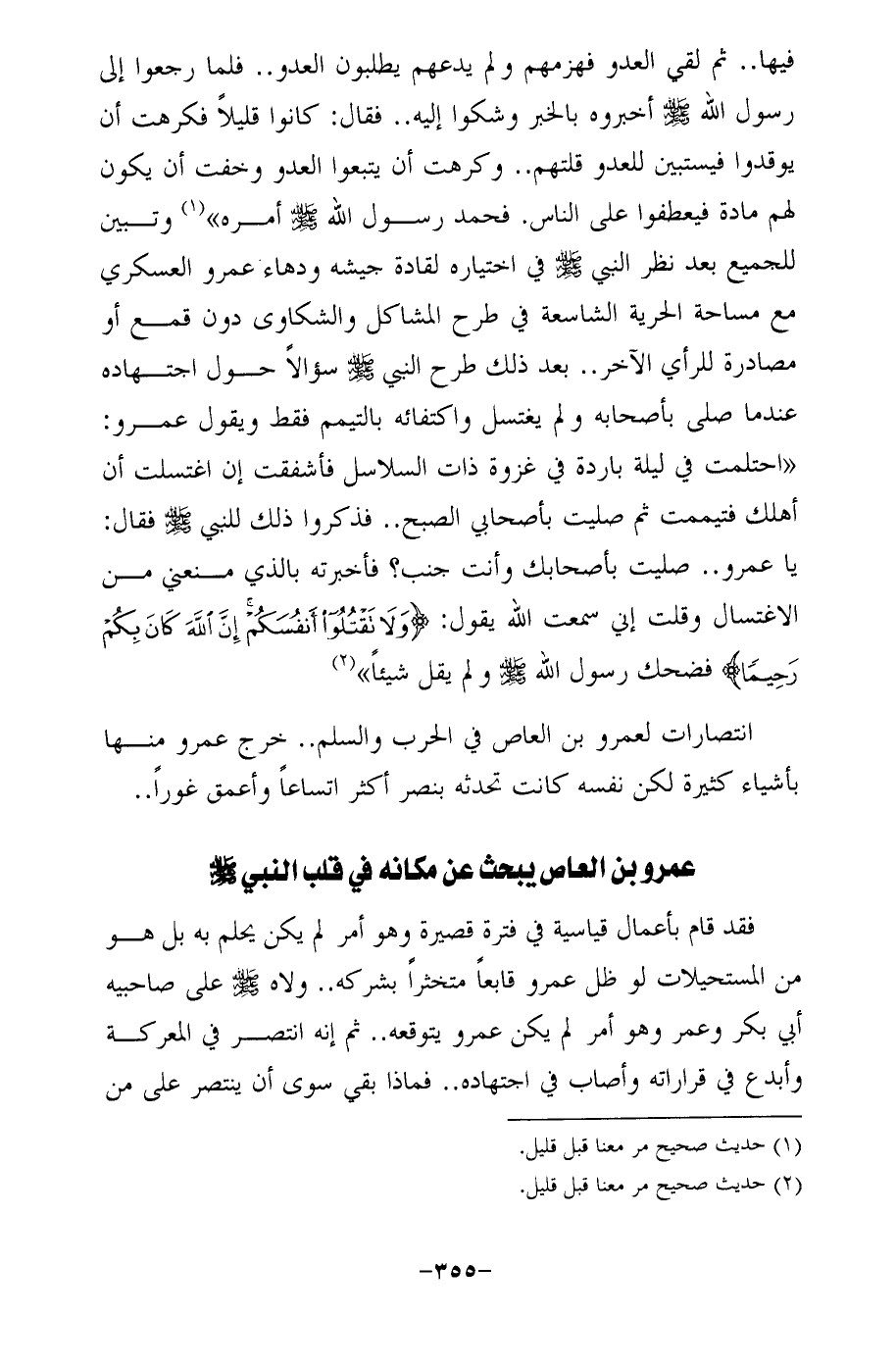 فيها .. ثم لقي العدو فهزمهم ولم يدعهم يطلبون العدو .. فلما رجعوا إلى رسول الله -صلى الله عليه وسلم- أخبروه بالخبر وشكوا إليه .. فقال: كانوا قليلًا فكرهت أن يوقدوا فيستبين للعدو قلتهم .. وكرهت أن يتبعوا العدو وخفت أن يكون لهم مادة فيعطفوا على الناس. فحمد رسول الله -صلى الله عليه وسلم- أمره" (¬1) وتبين للجميع بعد نظر النبي-صلى الله عليه وسلم- في اختياره لقادة جيشه ودهاء عمرو العسكري مع مساحة الحرية الشاسعة في طرح المشاكل والشكاوى دون قمع أو مصادرة للرأي الآخر .. بعد ذلك طرح النبي -صلى الله عليه وسلم-سؤالًا حول اجتهاده عندما صلى بأصحابه ولم يغتسل واكتفائه بالتيمم فقط ويقول عمرو: "احتلمت في ليلة باردة في غزوة ذات السلاسل فأشفقت إن اغتسلت أن أهلك فتيممت ثم صليت بأصحابي الصبح .. فذكروا ذلك للنبي-صلى الله عليه وسلم- فقال: يا عمرو .. صليت بأصحابك وأنت جنب؟ فأخبرته بالذي منعني من الاغتسال وقلت إني سمعت الله يقول: {وَلَا تَقْتُلُوا أَنْفُسَكُمْ إِنَّ اللَّهَ كَانَ بِكُمْ رَحِيمًا} فضحك رسول الله -صلى الله عليه وسلم- ولم يقل شيئًا" (¬2)