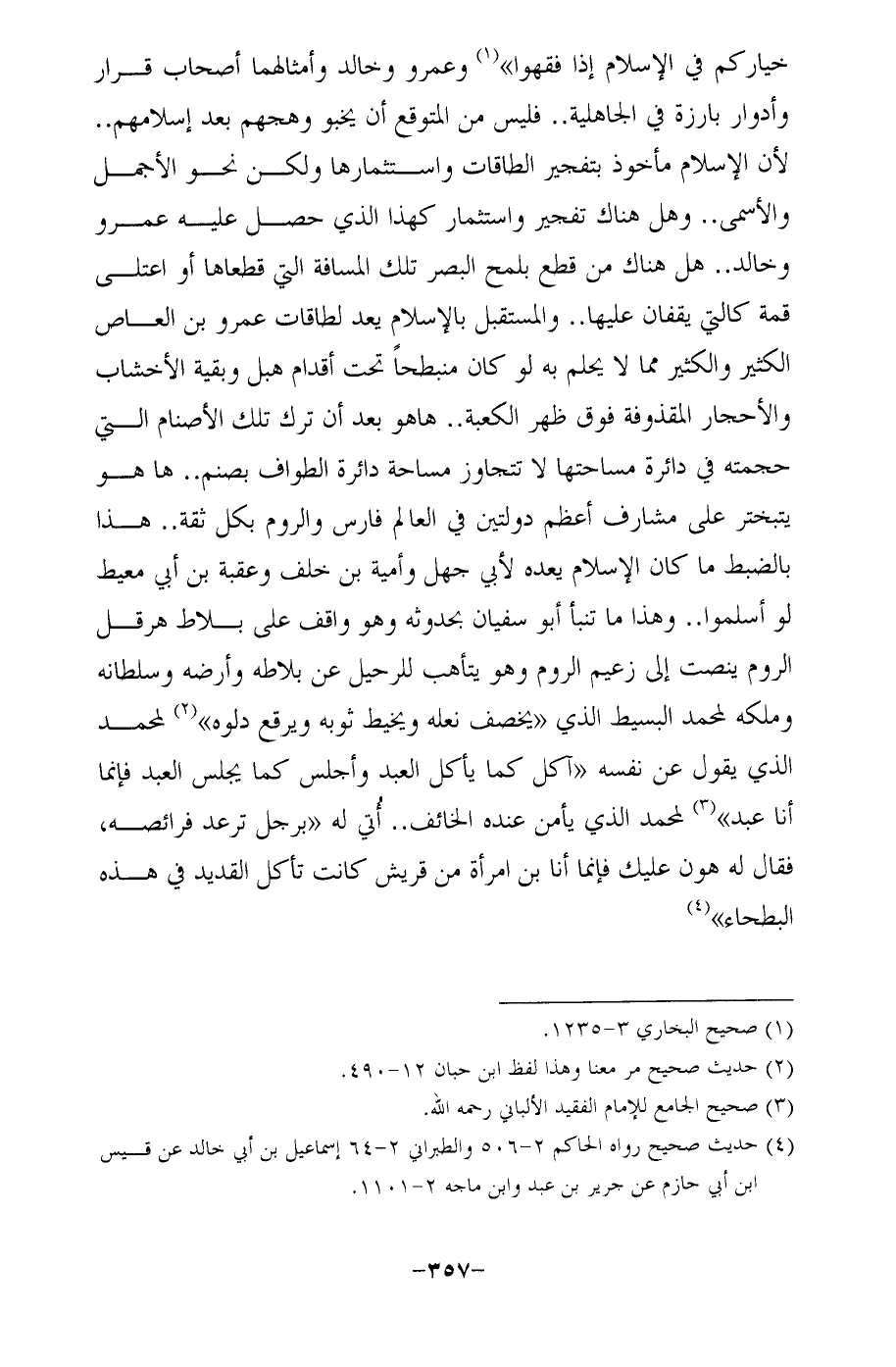 خياركم في الإسلام إذا فقهوا" (¬1) وعمرو وخالد وأمثالهما أصحاب قرار وأدوار بارزة في الجاهلية .. فليس من المتوقع أن يخبو وهجهم بعد إسلامهم .. لأن الإسلام مأخوذ بتفجير الطاقات واستثمارها ولكن نحو الأجمل والأسمى .. وهل هناك تفجير واستثمار كهذا الذي حصل عليه عمرو وخالد .. هل هناك من قطع بلمح البصر تلك المسافة التي قطعاها أو اعتلى قمة كالتي يقفان عليها .. والمستقبل بالإسلام يعد لطاقات عمرو بن العاص الكثير والكثير مما لا يحلم به لو كان منبطحًا تحت أقدام هبل وبقية الأخشاب والأحجار المقذوفة فوق ظهر الكعبة .. ها هو بعد أن ترك تلك الأصنام التي حجمته في دائرة مساحتها لا تتجاوز مساحة دائرة الطواف بصنم .. ها هو يتبختر على مشارف أعظم دولتين في العالم فارس والروم بكل ثقة .. هذا بالضبط ما كان الإسلام يعده لأبي جهل وأمية بن خلف وعقبة بن أبي معيط لو أسلموا .. وهذا ما تنبأ أبو سفيان بحدوثه وهو واقف على بلاط هرقل الروم ينصت إلى زعيم الروم وهو يتأهب للرحيل عن بلاطه وأرضه وسلطانه وملكه لمحمد البسيط الذي "يخصف نعله ويخيط ثوبه ويرقع دلوه" (¬2) لمحمد الذي يقول عن نفسه "آكل كما يأكل العبد وأجلس كما يجلس العبد فإنما أنا عبد" (¬3) لمحمد الذي يأمن عنده الخائف .. أُتي له "برجل ترعد فرائصه، فقال له هون عليك فإنما أنا بن امرأة من قريش كانت تأكل القديد في هذه البطحاء" (¬4)