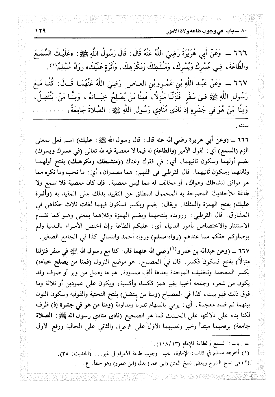 6668 - (وعن عبد الله بن عمرو رضي الله عنهما قال: كنا مع رسول الله في سفر فنزلنا منزلاً) بفتح فسكون فكسر قال في «المصباح» : هو موضع النزول (فمنا من يصلح خباءه) بكسر المعجمة وتخفيف الموحدة بعدها ألف ممدودة: هو ما يعمل من وبر أو صوف، وقد يكون من شعر وجمعه أخبية بغير همز ككساء وأكسية ويكون على عمودين أو ثلاثة وما فوق ذلك فهو بيت، كذا في المصباح (ومنا من ينتضل) بفتح التحتية والفوقية وسكون النون بينهما ثم ضاد معجمة: أي يرمي بالسهام تدرّباً ومداومة (ومنا من هو في جشره إذ) ظرف لـ «كنا» بناء على دلالتها على الحدث كما هو الصحيح (نادى منادي رسول الله الصلاة جامعة) برفعهما مبتدأ وخبر ونصبهما الأول على الإغراء والثاني على الحالية، ورفع الأول