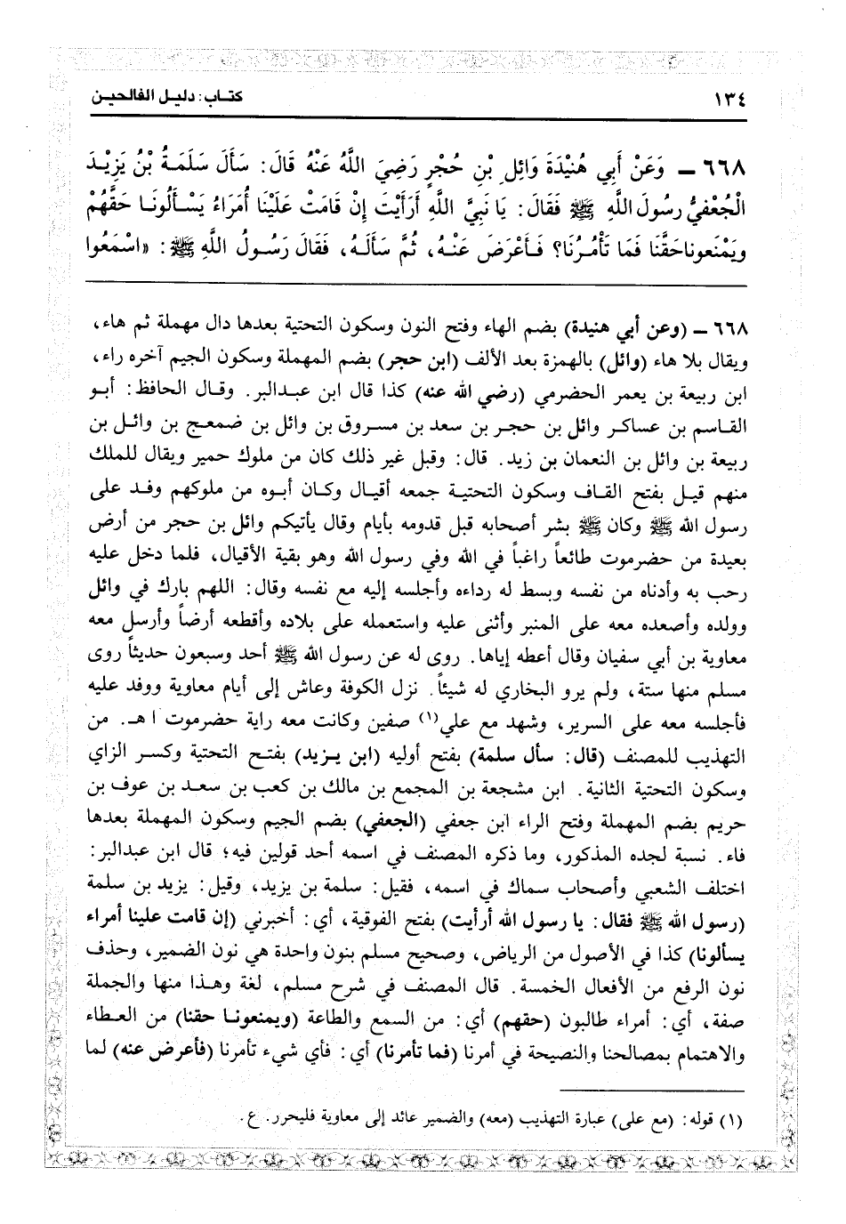 7669ـ (وعن أبي هنيدة) بضم الهاء وفتح النون وسكون التحتية بعدها دال مهملة ثم هاء ويقال بلا هاء (وائل) بالهمزة بعد الألف (ابن حجر) بضم المهملة وسكون الجيم آخره راء ابن ربيعة بن يعمر الحضرمي (رضي الله عنه) كذا قال ابن عبد البر، وقال الحافظ أبو القاسم ابن عساكر: وائل بن حجر بن سعد بن مسروق بن وائل بن ضمعج بن وائل بن ربيعة بن وائل بن النعمان بن زيد. قال: وقيل غير ذلك، كان من ملوك حمير ويقال للملك منهم قيل بفتح القاف وسكون التحتية جمعه أقيال وكان أبوه من ملوكهم. وفد على رسول الله وكان بشر أصحابه قبل قدومه بأيام وقال «يأتيكم وائل بن حجر من أرض بعيدة من حضرموت طائعاً راغباً في الله وفي رسول الله وهو بقية الأقيال» فلما دخل عليه رحب به وأدناه من نفسه وبسط له رداءه وأجلسه إليه مع نفسه وقال اللهم بارك في وائل وولده، وأصعده معه على المنبر وأثنى عليه واستعمله على بلاده وأقطعه أرضاً وأسل معه معاوية بن أبي سفيان وقال أعطه إياها، روى له عن رسول الله أحد وسبعون حديثاً روى مسلم منها ستة ولم يرو البخاري له شيئاً، نزل الكوفة وعاش إلى أيام معاوية ووفد عليه فأجلسه معه على السرير وشهد مع علي صفين وكانت معه راية حضرموت اهـ. من «التهذيب» للمصنف (قال: سأل سلمة) بفتح أوليه (ابن يزيد) بفتح التحتية وكسر الزاي وسكون التحتية الثانية ابن مشجعة بن المجمع بن مالك بن كعب بن سعد بن عوف بن حريم بضم المهملة وفتح الراء ابن جعفي (الجعفي) بضم الجيم وسكون المهملة بعدها فاء نسبة لجده المذكور، وما ذكره المصنف