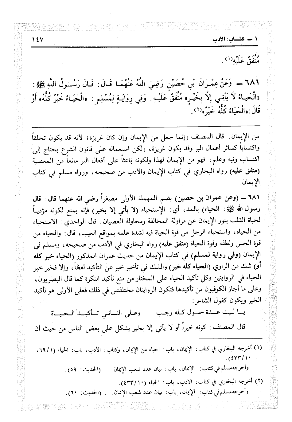 من الإيمان» قال المصنف: وإنما جعل من الإيمان وإن كان غريزة لأنه قد يكون تخلقاً واكتساباً أعمال البر، وقد يكون غريزة ولكن استعماله على قانون الشرع يحتاج إلى اكتساب ونية علم فهو من الإيمان لهذا ولكونه باعثاً على أفعال البر مانعاً من المعصية (متفق عليه) رواه البخاري في كتاب الإيمان والأدب من «صحيحه» ، ورواه مسلم في كتاب الإيمان.