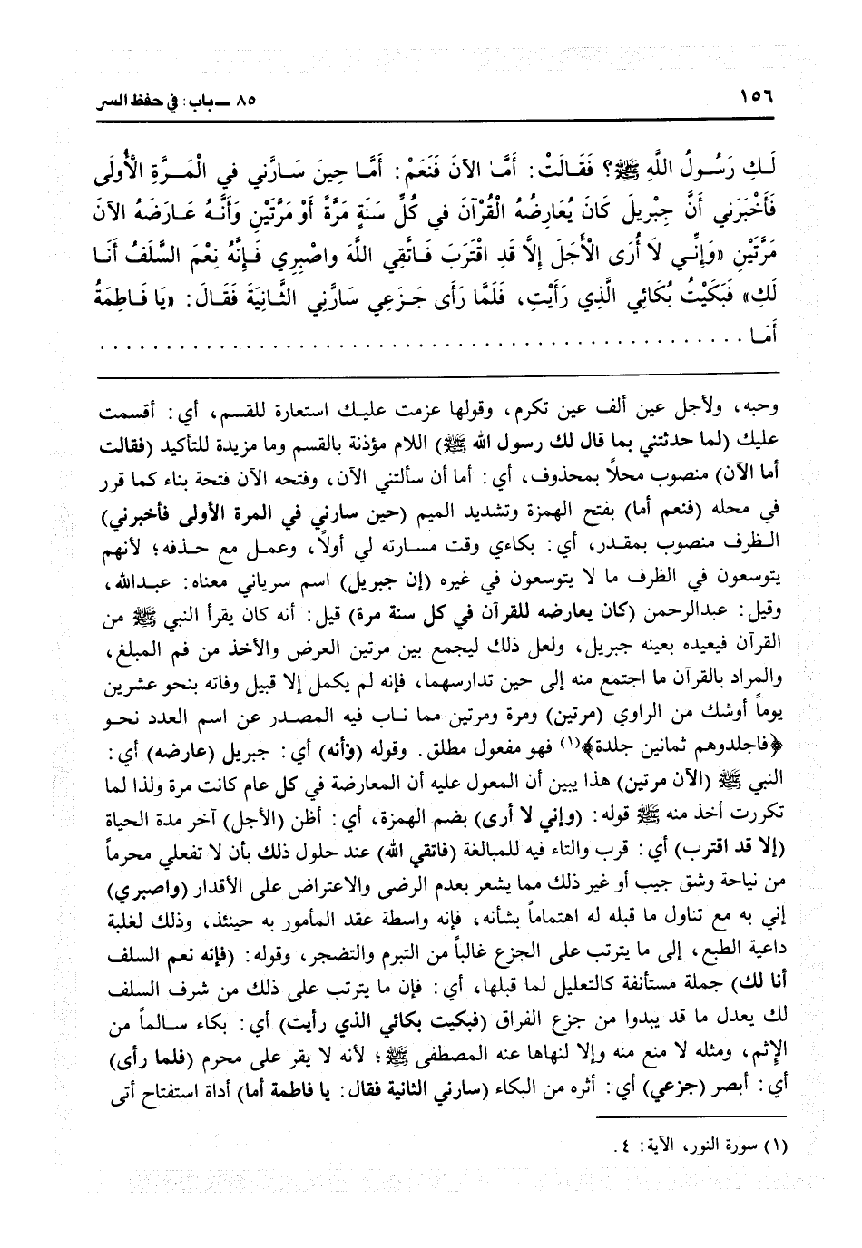 جبريل) اسم سرياني معناه عبد الله وقيل عبد الرحمن (كان يعارضه للقرآن في كل سنة مرة) قيل إنه كان يقرأ النبي من القرآن فيعيده بعينه جبريل، ولعل ذلك ليجمع بين مرتين العرض والأخذ من فم المبلغ، والمراد بالقرآن ما اجتمع منه إلى حين تدارسهما فإنه لم يكمل إلا قبيل وفاته بنحو عشرين يوماً (أو) شك من الراوي (مرتين) ومرة ومرتين مما ناب فيه المصدر عن اسم العدد نحو «فاجلدوهم ثمانين جلدة» فهو مفعول مطلق وقوله (وأنه) أي جبريل (عارضه) أي النبي (الآن مرتين) هذا يبين أن المعوّل عليه أن المعارضة في كل عام كانت مرة ولذا لما تكررت، أخذ منه قوله (وإني لا أرى) بضم الهمزة: أي أظن (الأجل) آخر مدة الحياة (إلا قد اقترب) أي قرب والتاء فيه للمبالغة (فاتقى الله) عند حلول ذلك بأن لا تفعلي محرّماً من نياحة وشق جيب أو غير ذلك مما يشعر بعدم الرضى والاعتراض على الأقدار (واصبري) أتى به مع تناول ما قبله له اهتماماً بشأنه، فإنه واسطة عقد المأمور به حينئذ وذلك لغلبة داعية الطبع إلى ما يترتب على الجزع غالباً من التبرم والتضجر وقوله (فإنه نعم السلف أنا لك) جملة مستأنفة كالتعليل لما قبلها: أي فإن ما يترتب على ذلك من شرف السلف لك يعدل ما قد يبدو من جزع الفراق (فبكيت بكائي الذي رأيت) أي بكاء سالماً من الإثم ومثله لا منع منه وإلا لنهاها عنه المصطفى لأنه لا يقر على محرم (فلما رأى) أي أبصر (جزعي) أي أثره من البكاء (سارّني الثانية فقال: يا فاطمة أما) أداة استفتاح أتى