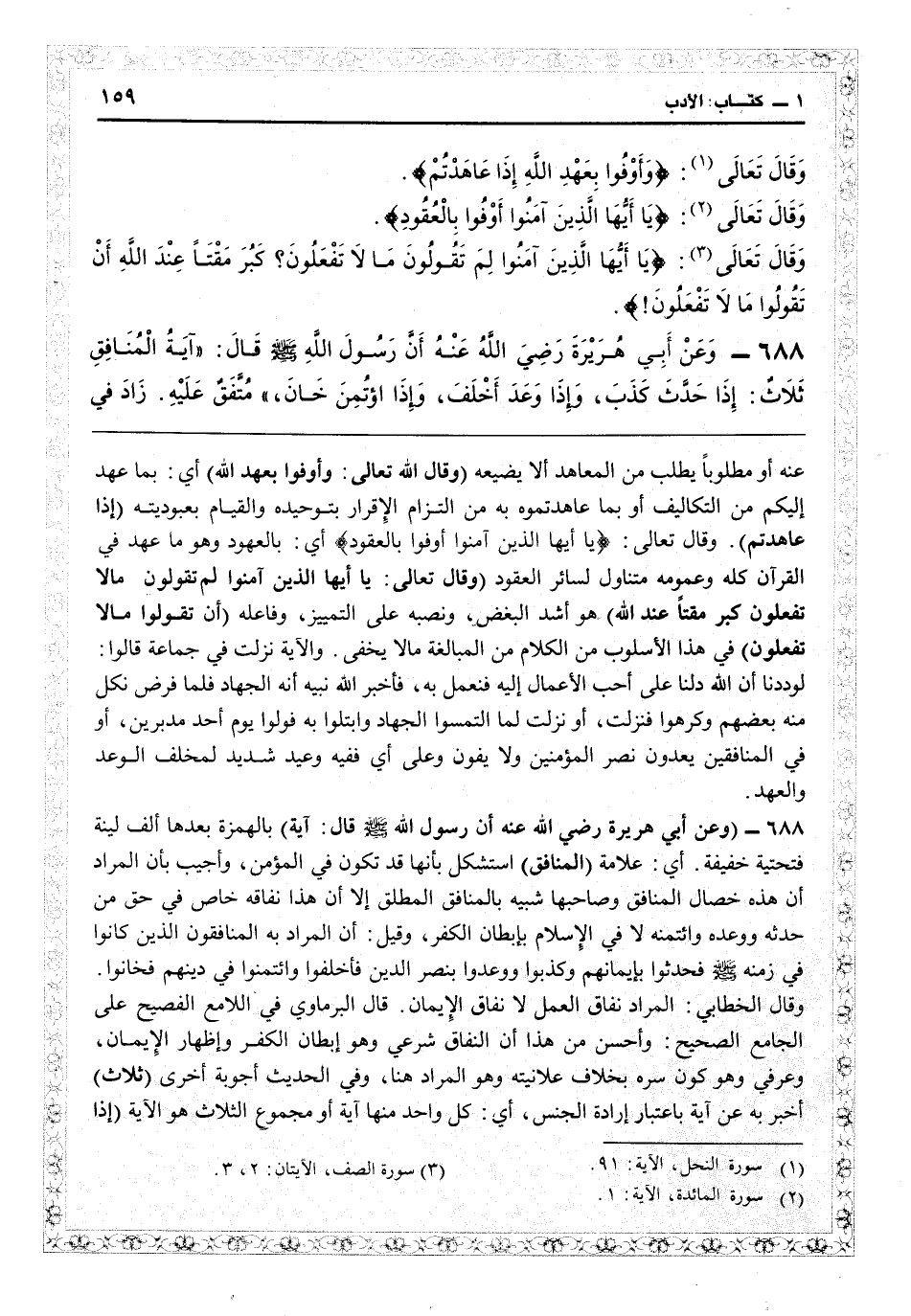 1689 - (وعن أبي هريرة رضي الله عنه أن رسول الله قال: آية) بالهمزة بعدها ألف لينة فتحتية خفيفة: أي علامة (المنافق) استشكل بأنها قد تكون في المؤمن وأجيب بأن المراد أن هذه خصال المنافق وصاحبها شبيه بالمنافق المطلق إلا أن هذا نفاقه خاص في حق من حدثه ووعده وائتمنه لا في الإسلام بإبطان الكفر. وقيل إن المراد به المنافقون الذين كانوا في زمنه فحدثوا بإيمانهم وكذبوا ووعدوا بنصر الدين فأخلفوا وأئتمنوا في دينهم فخانوا. وقال الخطابي: المراد نفاق العمل لا نفاق الإيمان. قال البرماوي في «اللامع الفصيح على الجامع الصحيح» وأحسن من هذا أن النفاق شرعي وهو إبطان الكفر وإظهار الإيمان، وعرفى وهو كون سرّه بخلاف علانيته وهو المراد هنا، وفي الحديث أجوبة أخرى (ثلاث) أخبر به آية باعتبار إرادة الجنس: أي كل واحد منها آية أو أن مجموع الثلاث هو الآية (إذا