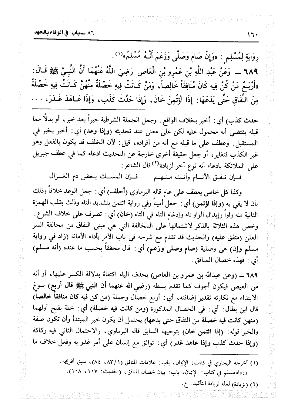 2690 - (وعن عبد الله بن عمرو بن العاص) بحذف الياء اكتفاء بدلالة الكسر عليها أو أنه من العيص فيكون أجوف كما تقدم بسطه (رضي الله عنهما أن النبيّ قال: أربع) سوغ الابتداء به مع نكارته تقدير إضافته أي أربع خصال، وجملة (من كن فيه كان منافقاً خالصاً) قال ابن بطال: أي في الخصال المذكورة (ومن كانت فيه خصلة) أي خلة بفتح أولهما (منهن كانت فيه خصلة من النفاق حي يدعها) يحتمل أن يكون خبر المبتدأ وأن تكون صفة والخبر قوله (إذا اؤتمن خان) بتوجيهه السابق قاله البرماوي، والاحتمال الثاني فيه ركاكة (وإذا حدث كذب وإذا عاهد غدر) أي تواثق مع إنسان على أمر غدر به وفعل خلاف ما