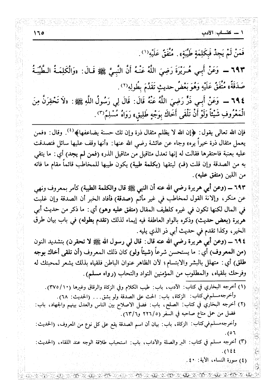 2694 - (وعن أبي هريرة رضي الله عنه أن النبي قال: والكلمة الطيبة) كأمر بمعروف ونهي عن منكر، وإلانة القول لمخاطب في غير مأثم (صدقة) فأفاد الخبر أن الصدقة وإن غلبت في المال لكنها تكون في غيره كلطيف المقال (متفق عليه وهو) أي ما ذكر من حديث أبي هريرة (بعض حديث) وذكره بالواو العاطفة فيه إيماء لذلك (تقدم بطوله) في باب بيان طرق الخير وكذا تقدم في حديث أبي ذر الذي يليه.