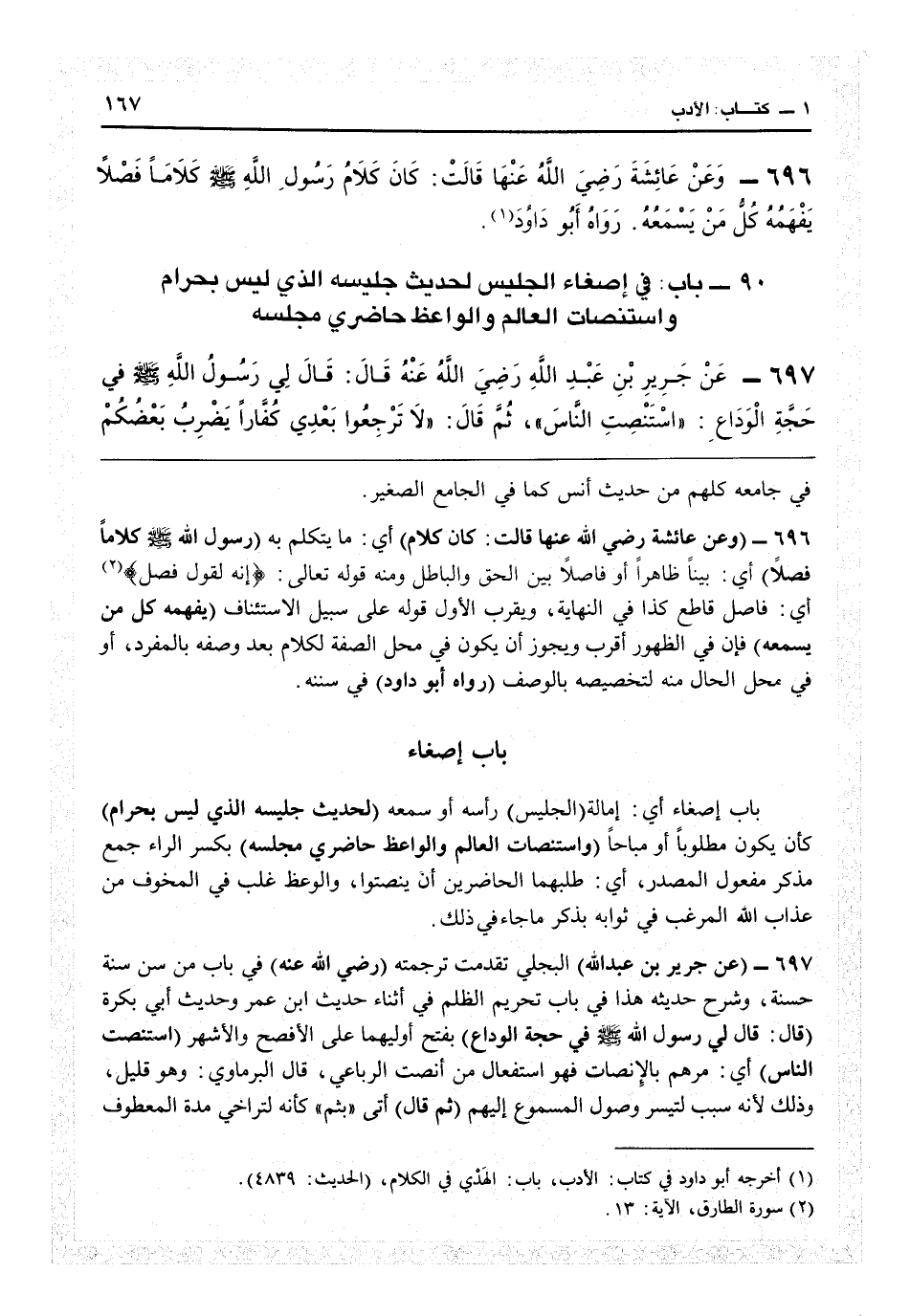 أي إمالة (الجليس) رأسه أو سمعه (لحديث جليسه الذي ليس بحرام) كأن يقول مطلوباً أو مباحاً (واستنصات العالم والواعظ حاضري مجلسه) بكسر الراء جمع مذكر مفعول المصدر أي طلبهما الحاضرين أن ينصتوا، والوعظ غلب في المخوف من عذاب الله المرغب في ثوابه بذكر ما جاء في ذلك.